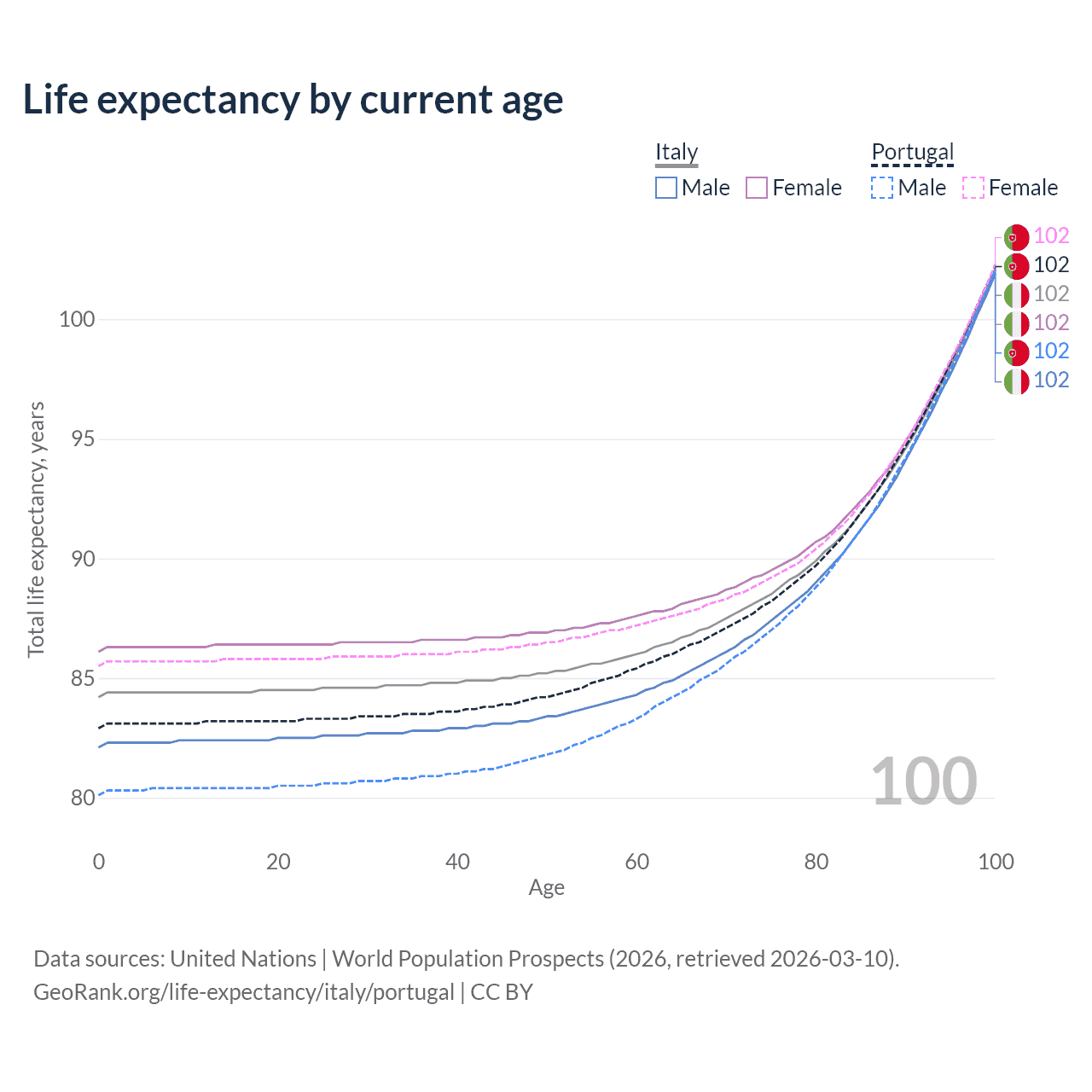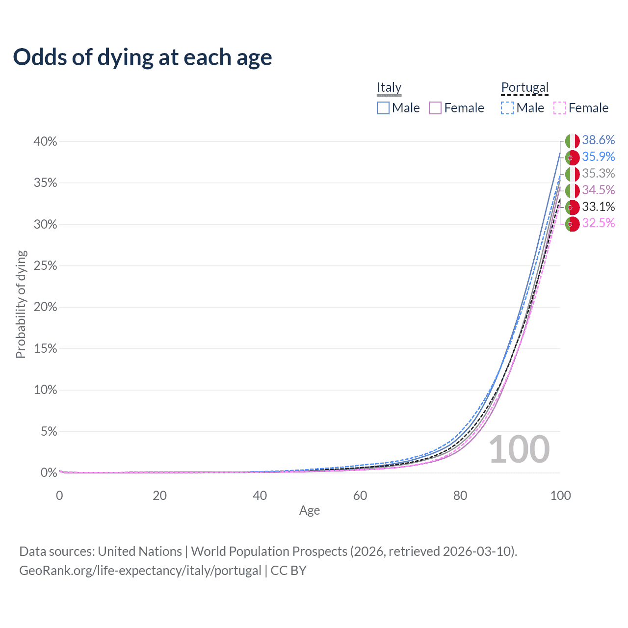 This life expectancy calculator shows the odds of living to 100, 95, 90, and below based on current age for both males and females in Italy and Portugal, along with mean and median age of death. The calculations are based on the 2026 life tables (actuarial tables) from the UN World Population Prospects.