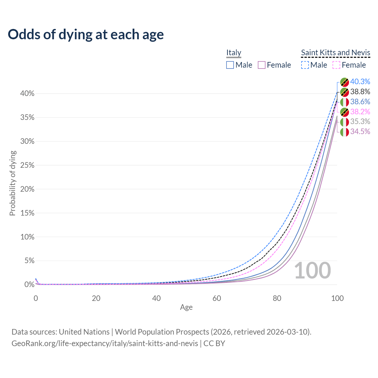This life expectancy calculator shows the odds of living to 100, 95, 90, and below based on current age for both males and females in Italy and Saint Kitts and Nevis, along with mean and median age of death. The calculations are based on the 2026 life tables (actuarial tables) from the UN World Population Prospects.