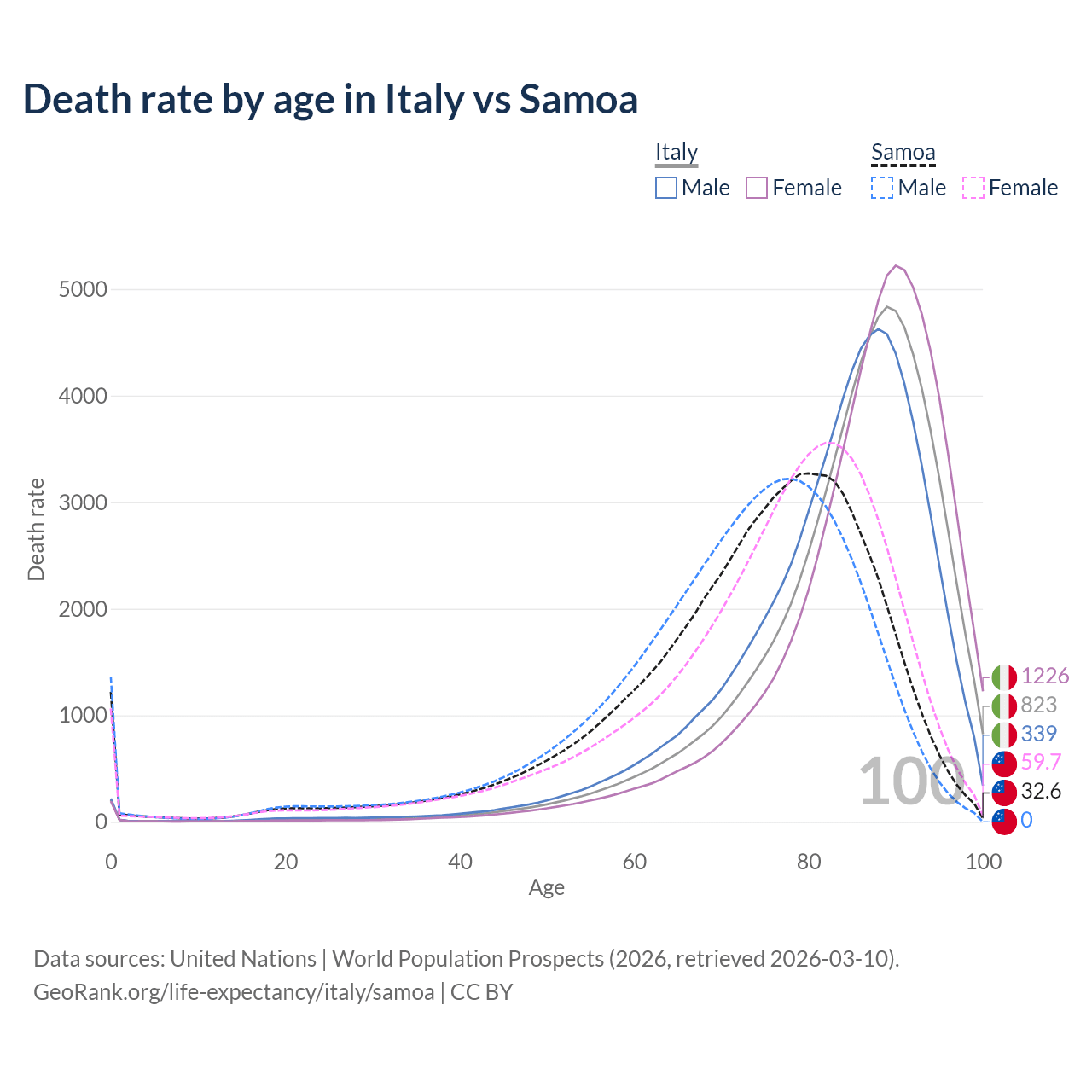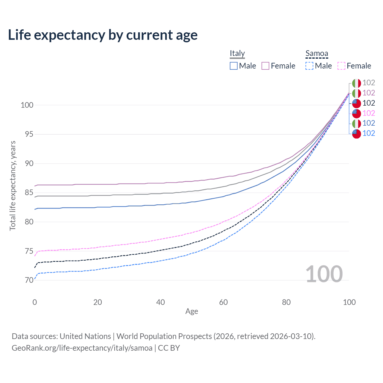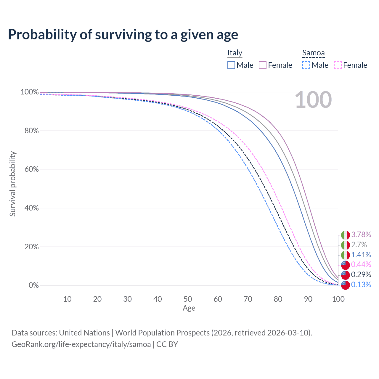This life expectancy calculator shows the odds of living to 100, 95, 90, and below based on current age for both males and females in Italy and Samoa, along with mean and median age of death. The calculations are based on the 2026 life tables (actuarial tables) from the UN World Population Prospects.
