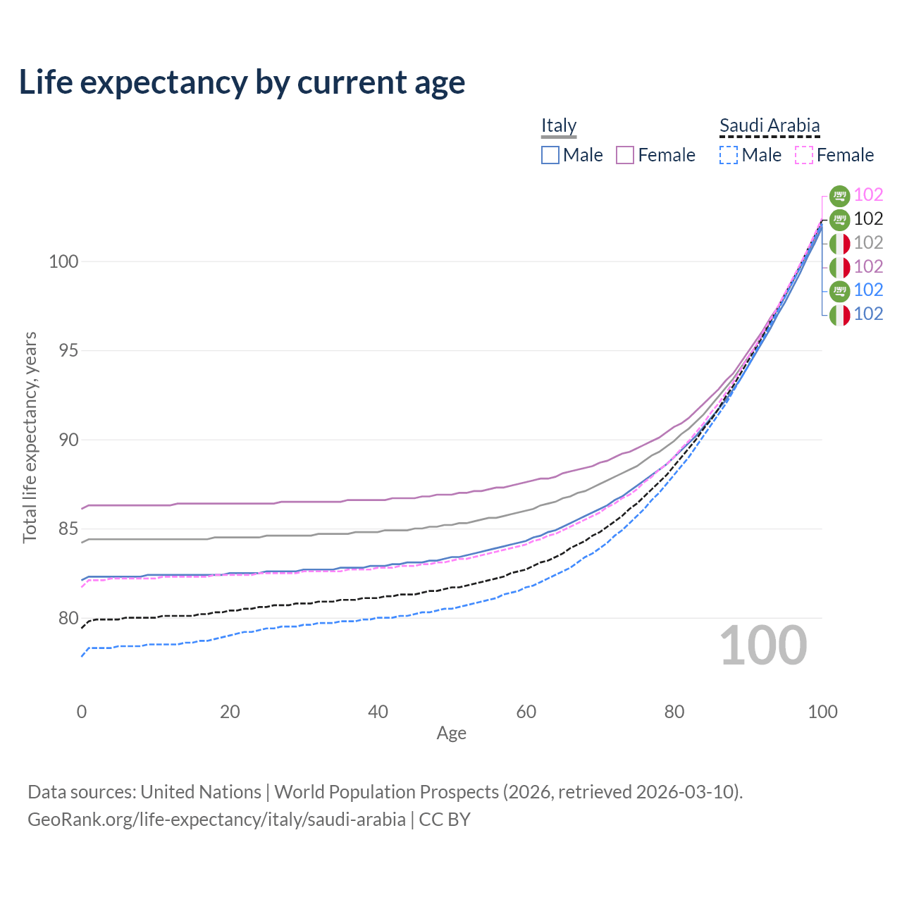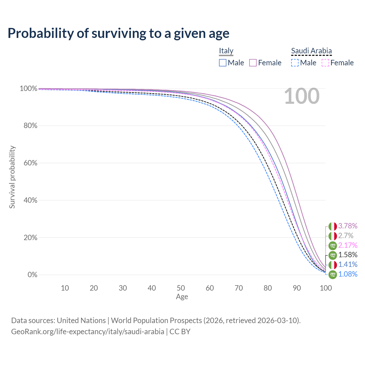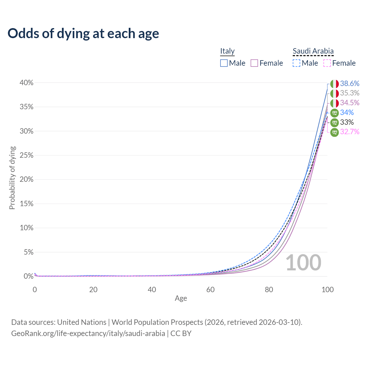 This life expectancy calculator shows the odds of living to 100, 95, 90, and below based on current age for both males and females in Italy and Saudi Arabia, along with mean and median age of death. The calculations are based on the 2026 life tables (actuarial tables) from the UN World Population Prospects.