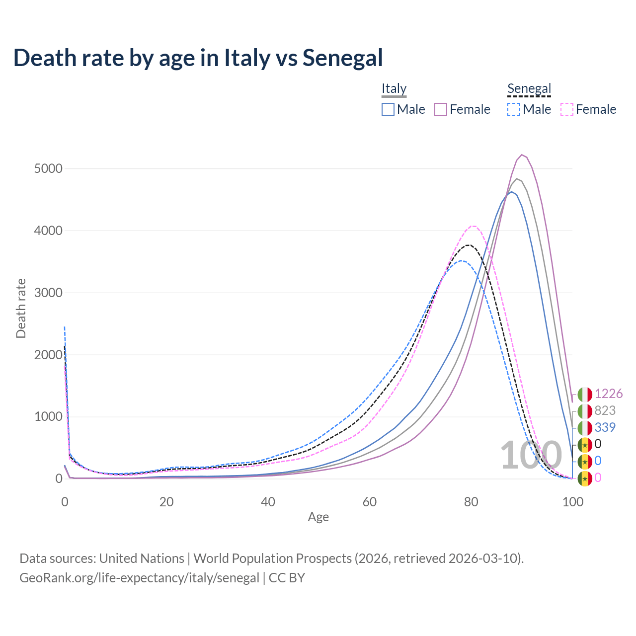 The average life expectancy at birth is 84.2 years in Italy vs 69.4 in Senegal. Italy is ranked 8/197 by life expectancy, and Senegal is 143/197. In Italy, the life expectancy is 82.1 years for males and 86.1 years for females. In Senegal, it's 67.4 years for males and 71.5 years for females.