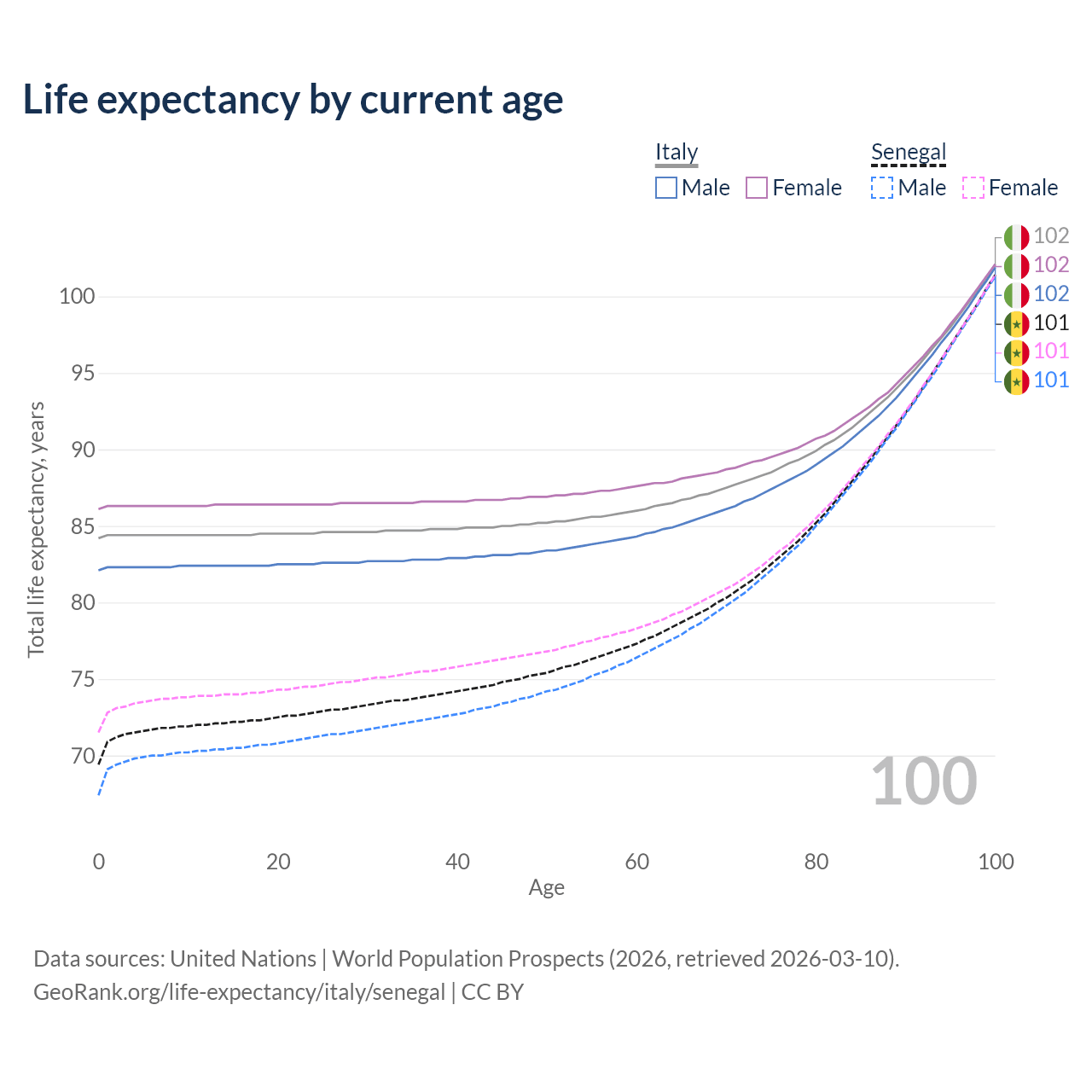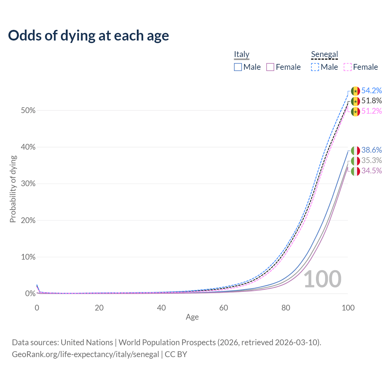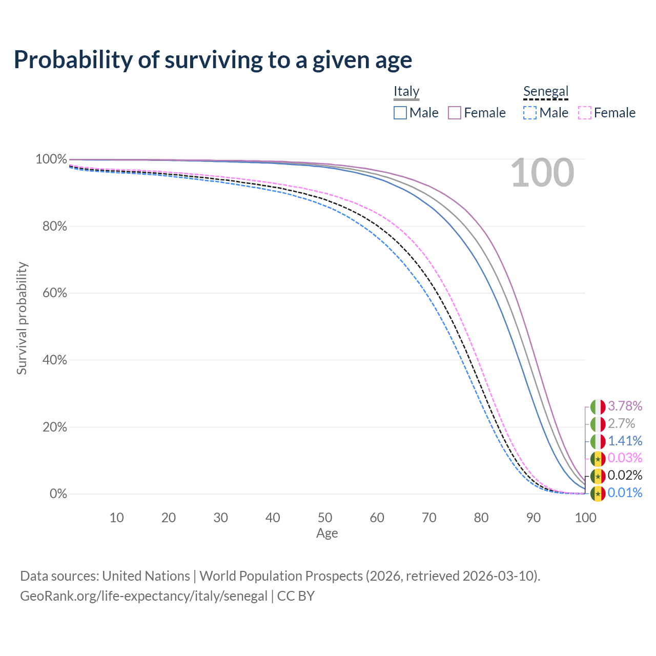 This life expectancy calculator shows the odds of living to 100, 95, 90, and below based on current age for both males and females in Italy and Senegal, along with mean and median age of death. The calculations are based on the 2026 life tables (actuarial tables) from the UN World Population Prospects.