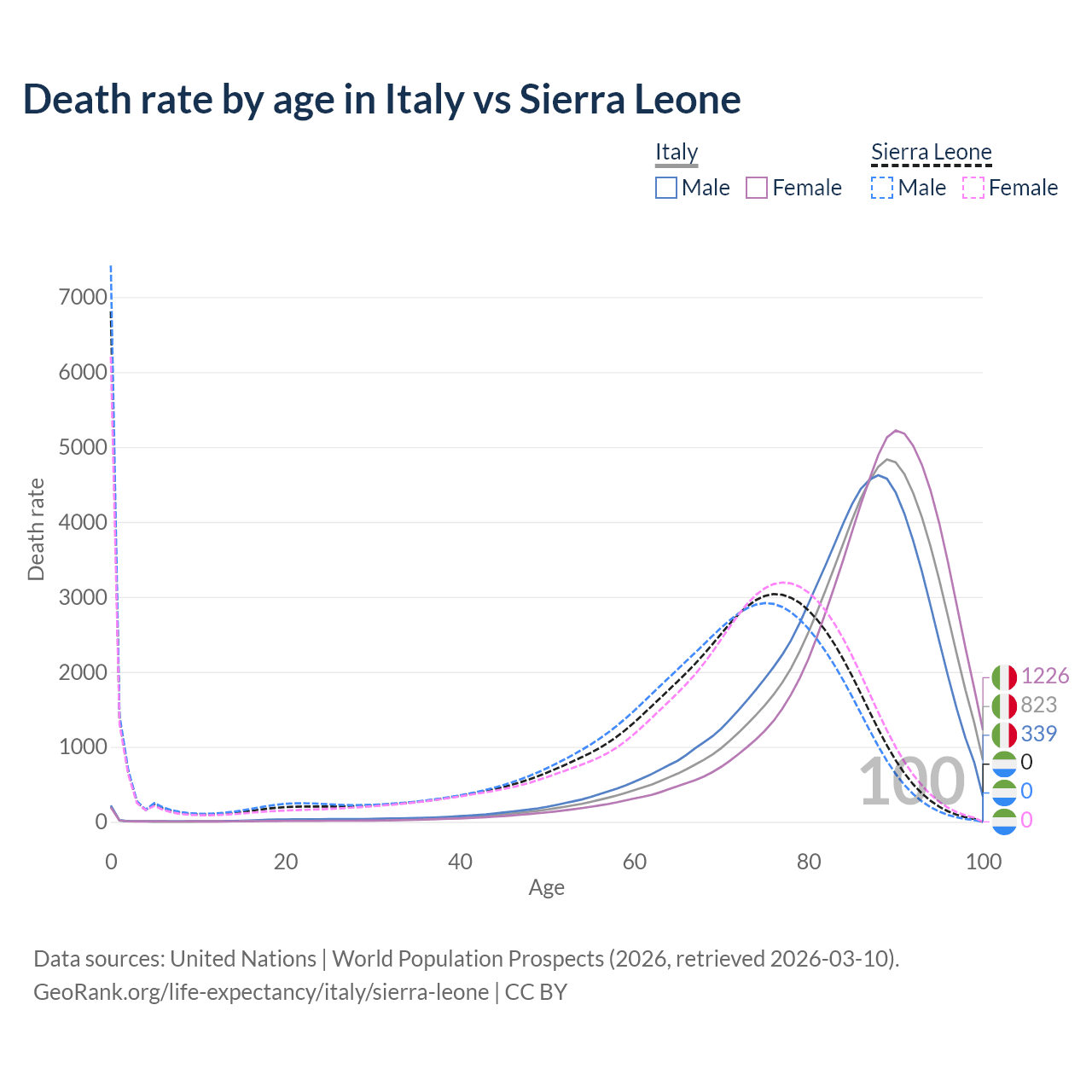In Italy, the most common age of death is 89, compared to 0 in Sierra Leone. The median age of death is 86.9 in Italy and 70.8 in Sierra Leone, meaning only half of each cohort is expected to live past that age.