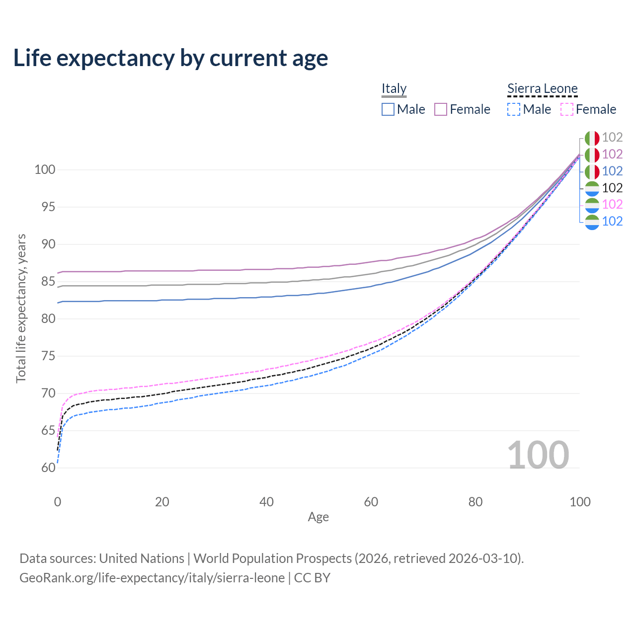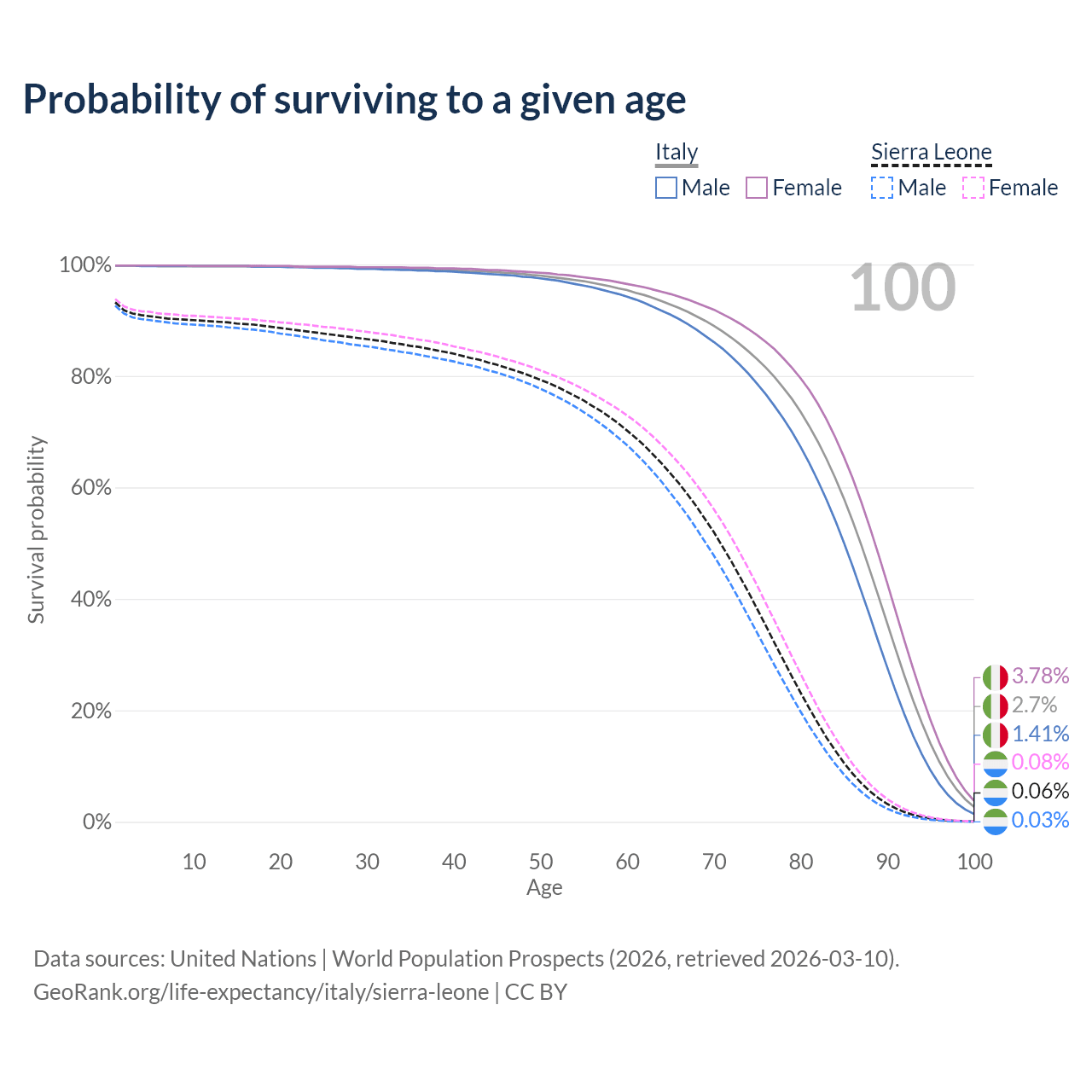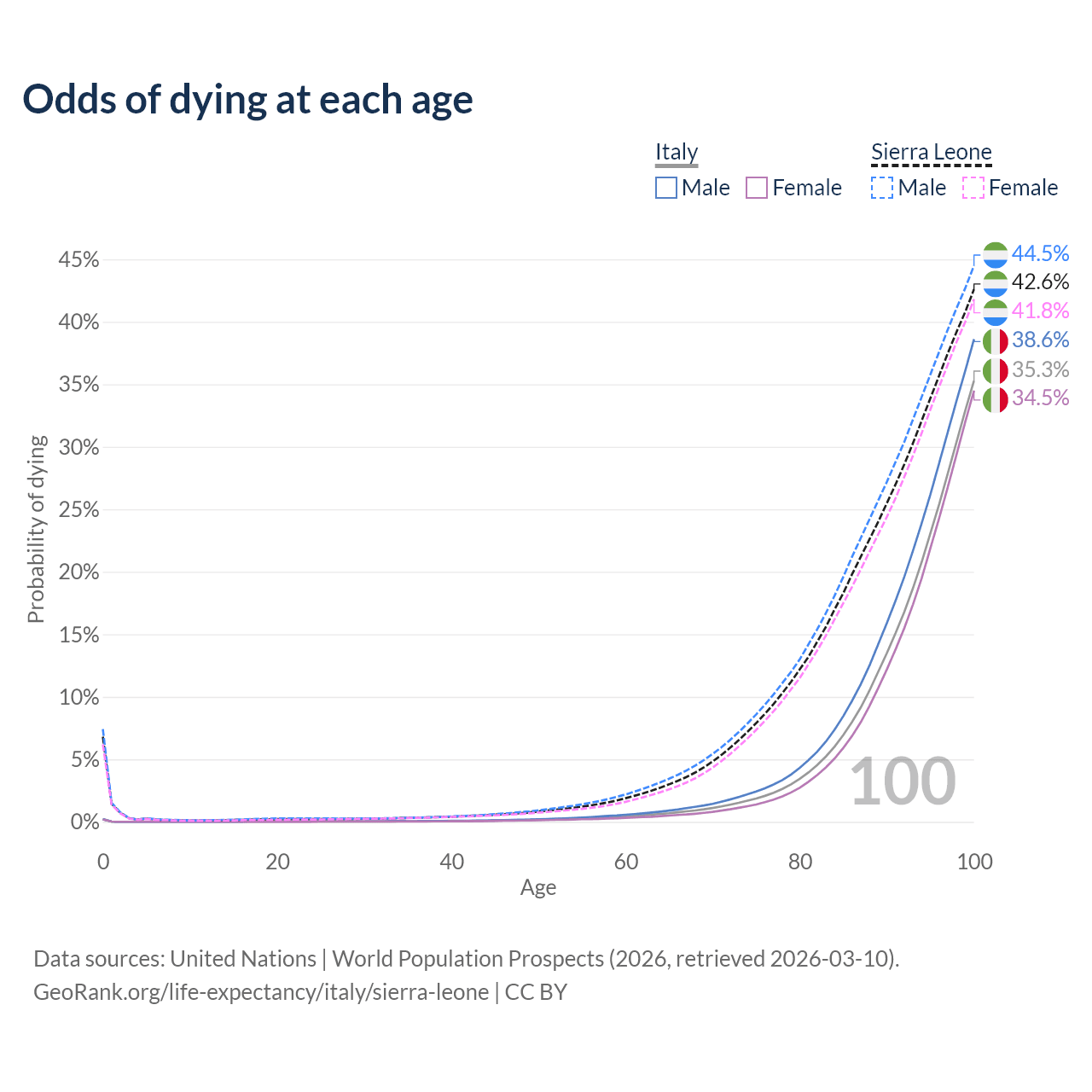 This life expectancy calculator shows the odds of living to 100, 95, 90, and below based on current age for both males and females in Italy and Sierra Leone, along with mean and median age of death. The calculations are based on the 2026 life tables (actuarial tables) from the UN World Population Prospects.