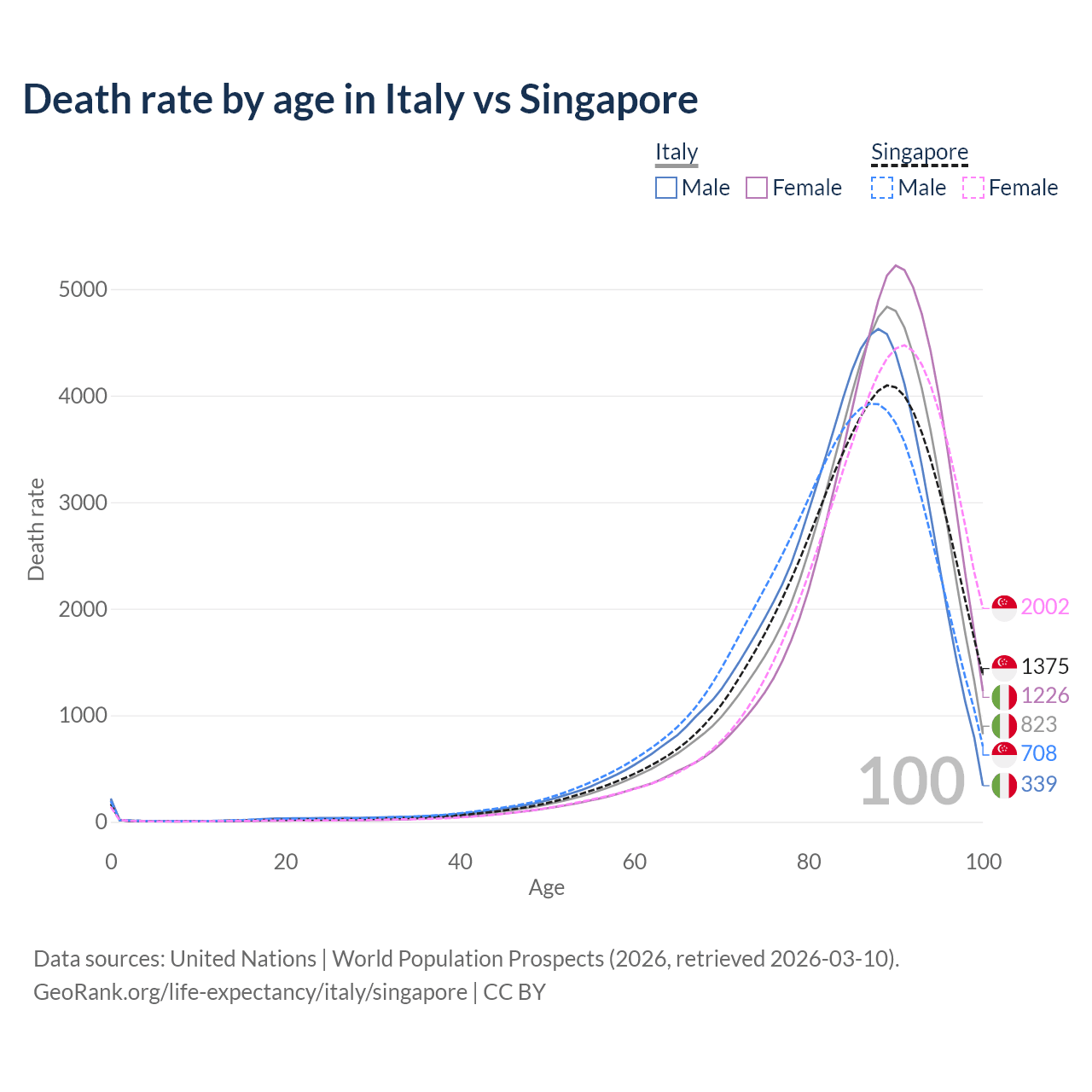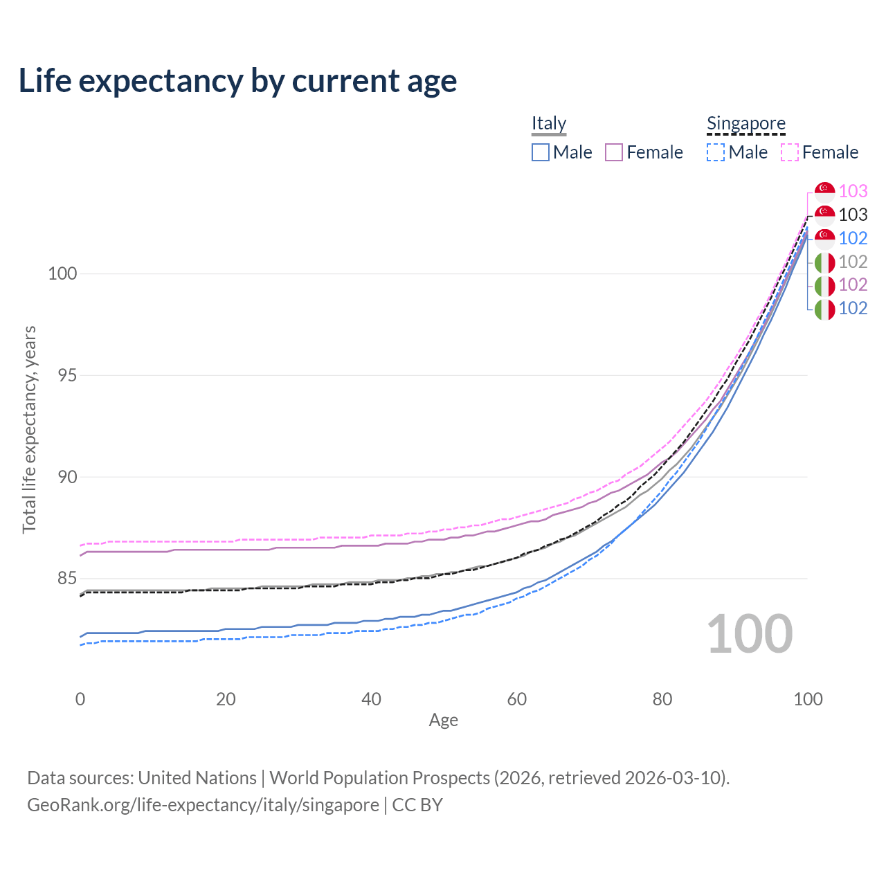 This life expectancy calculator shows the odds of living to 100, 95, 90, and below based on current age for both males and females in Italy and Singapore, along with mean and median age of death. The calculations are based on the 2026 life tables (actuarial tables) from the UN World Population Prospects.