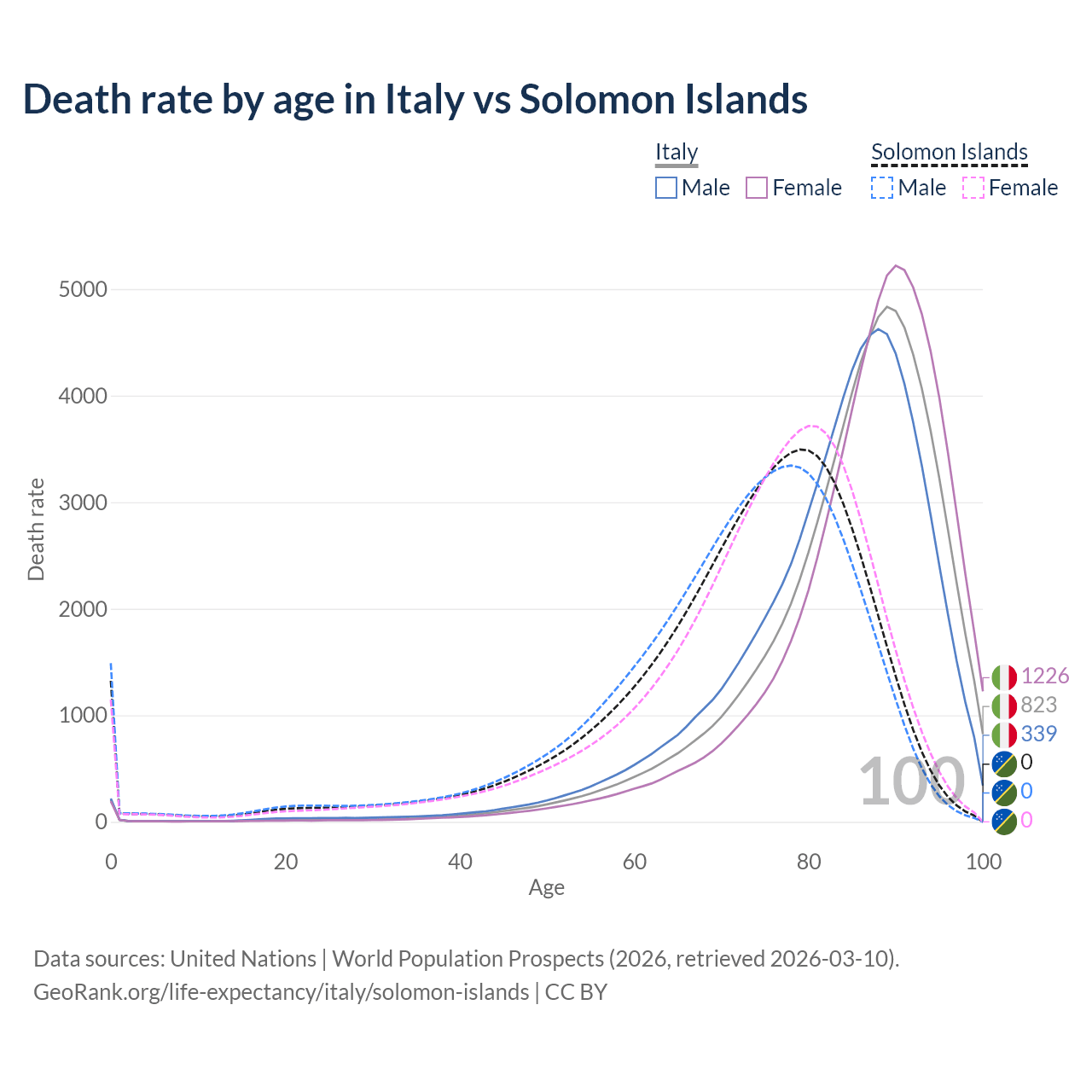 In Italy, the most common age of death is 89, compared to 79 in the Solomon Islands. The median age of death is 86.9 in Italy and 74.9 in the Solomon Islands, meaning only half of each cohort is expected to live past that age.