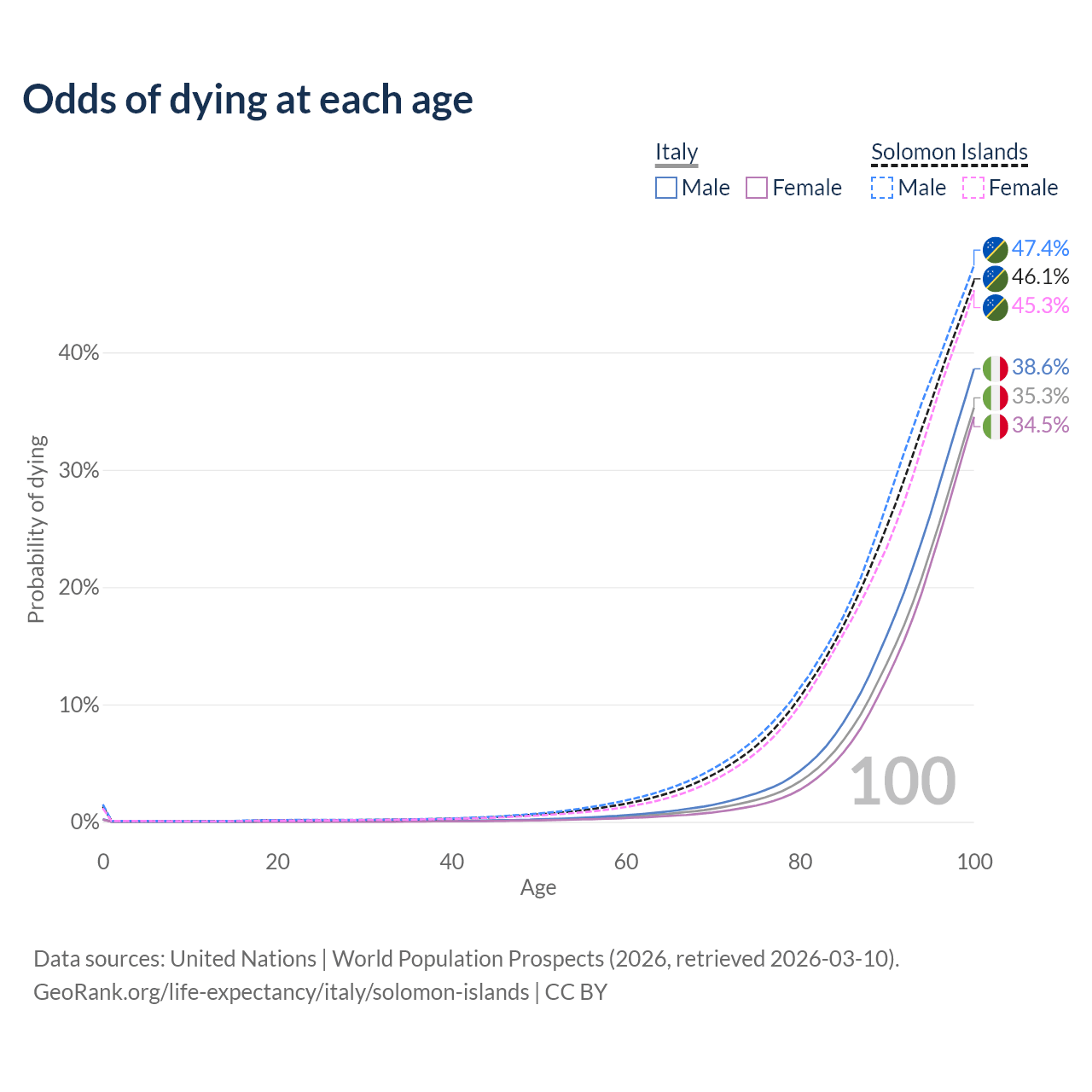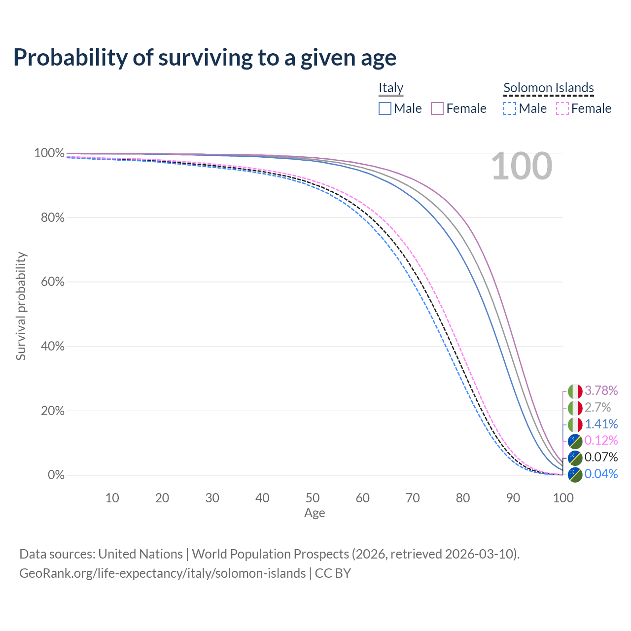 This life expectancy calculator shows the odds of living to 100, 95, 90, and below based on current age for both males and females in Italy and the Solomon Islands, along with mean and median age of death. The calculations are based on the 2026 life tables (actuarial tables) from the UN World Population Prospects.