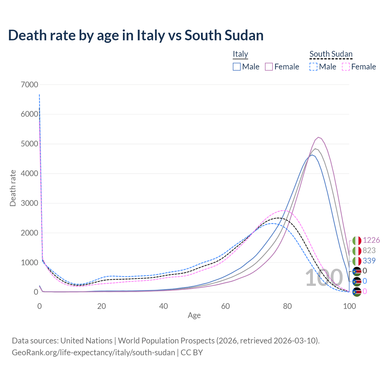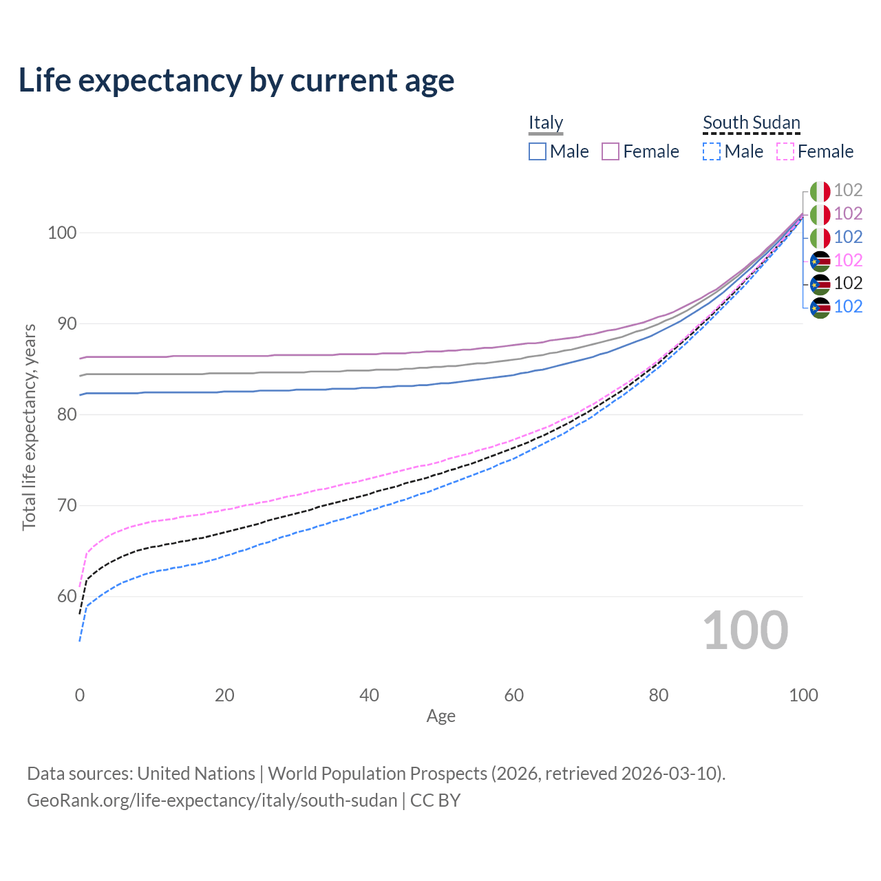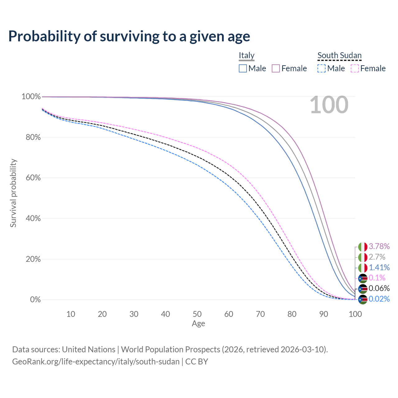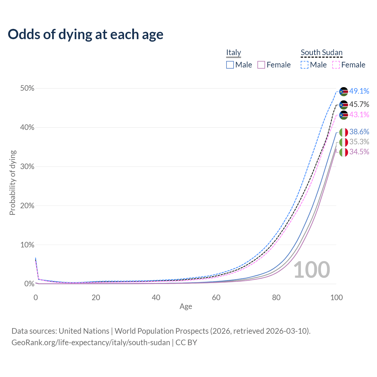 This life expectancy calculator shows the odds of living to 100, 95, 90, and below based on current age for both males and females in Italy and South Sudan, along with mean and median age of death. The calculations are based on the 2026 life tables (actuarial tables) from the UN World Population Prospects.