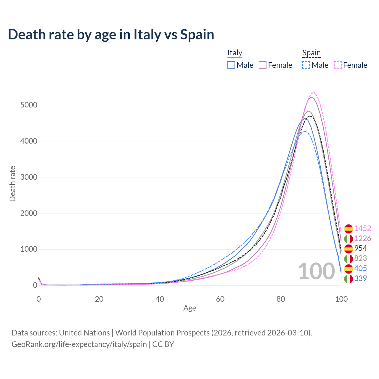 In Italy, the most common age of death is 89, compared to 90 in Spain. The median age of death is 86.9 in Italy and 87 in Spain, meaning only half of each cohort is expected to live past that age.