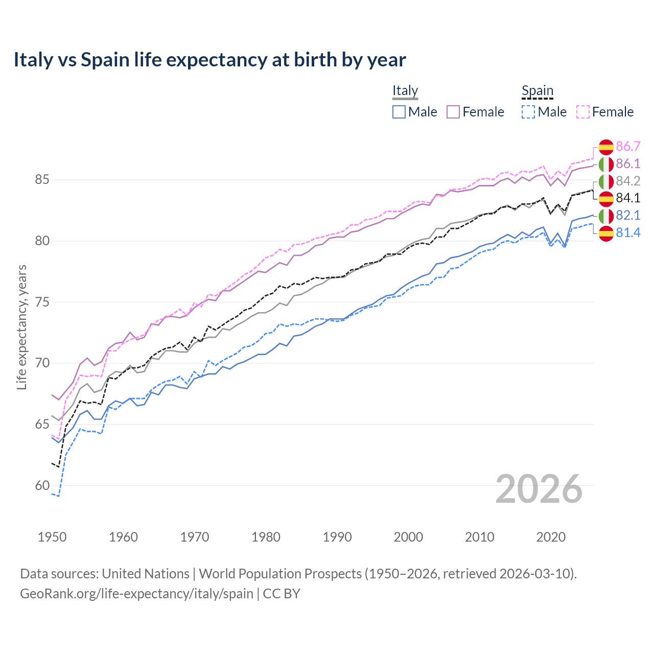 The average life expectancy at birth is 84.2 years in Italy vs 84.1 in Spain. Italy is ranked 8/197 by life expectancy, and Spain is 10/197. In Italy, the life expectancy is 82.1 years for males and 86.1 years for females. In Spain, it's 81.4 years for males and 86.7 years for females.