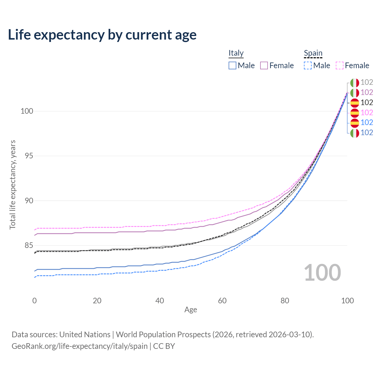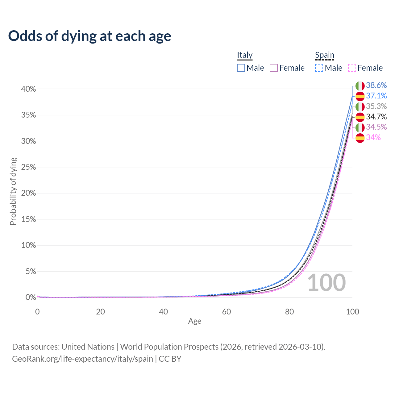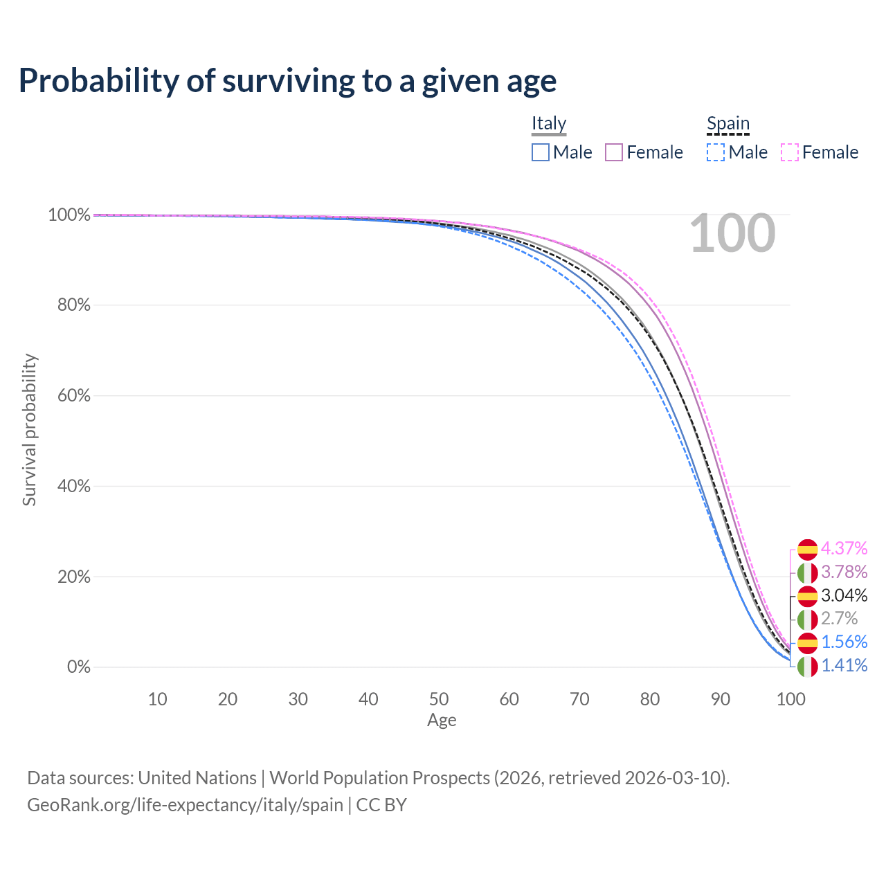 This life expectancy calculator shows the odds of living to 100, 95, 90, and below based on current age for both males and females in Italy and Spain, along with mean and median age of death. The calculations are based on the 2026 life tables (actuarial tables) from the UN World Population Prospects.