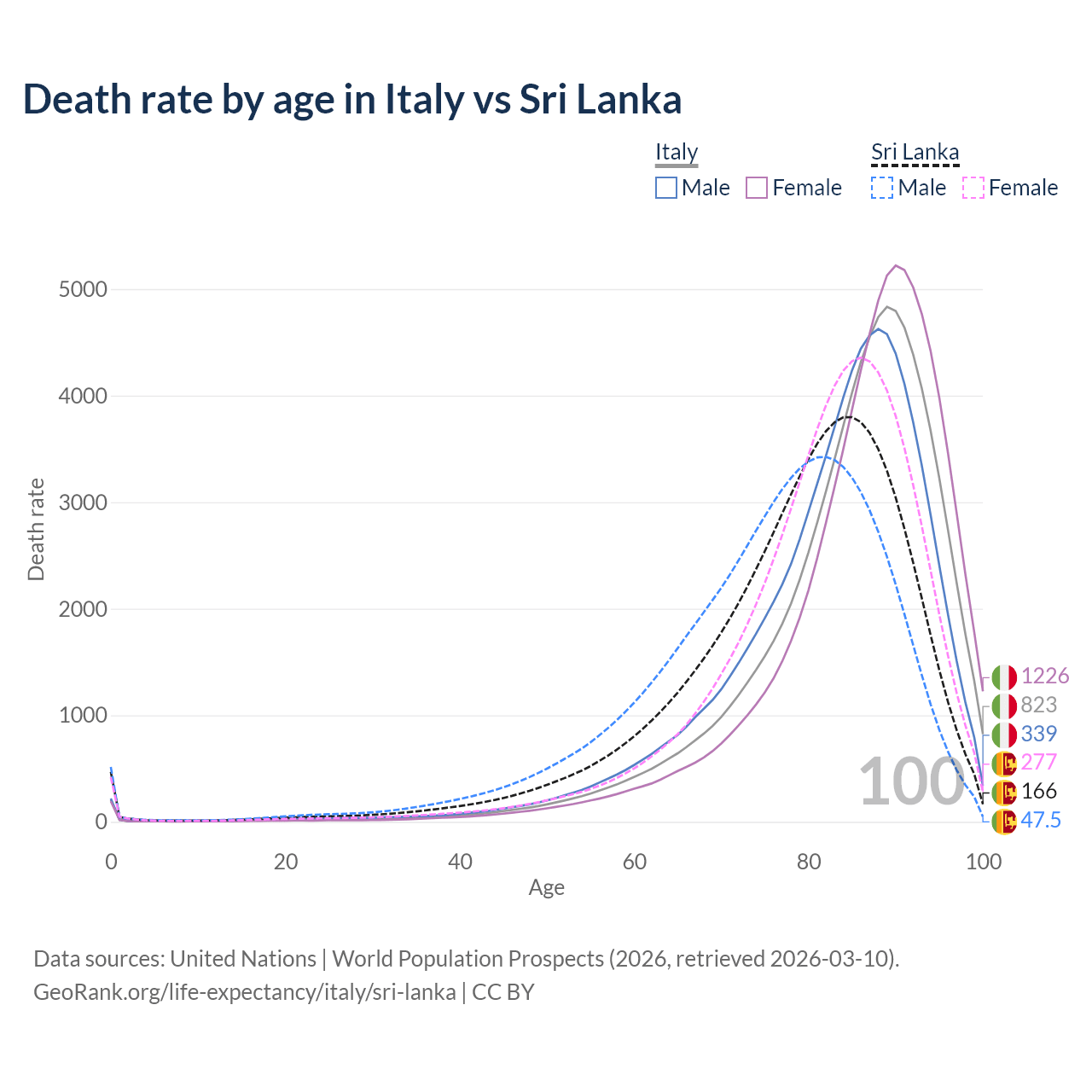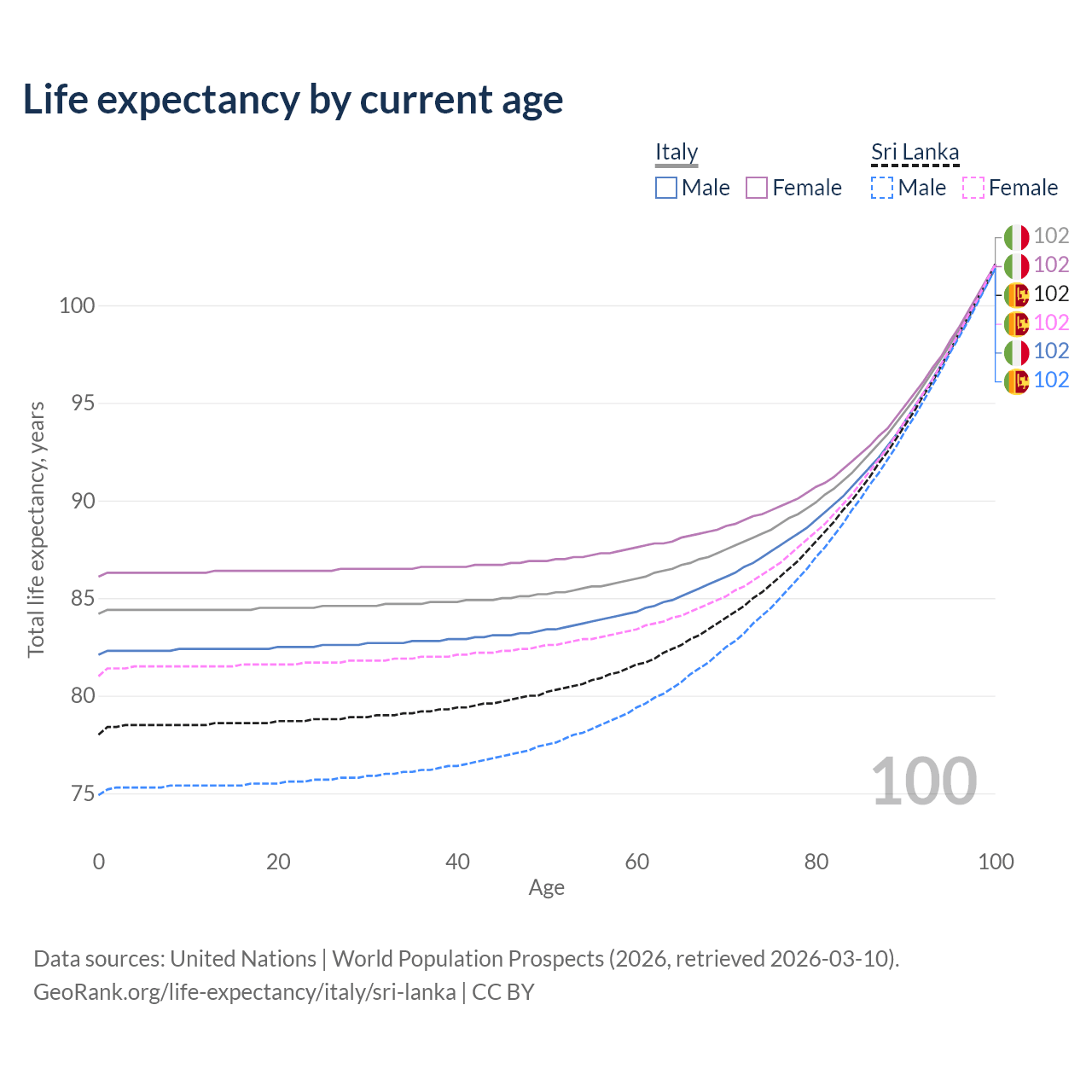 This life expectancy calculator shows the odds of living to 100, 95, 90, and below based on current age for both males and females in Italy and Sri Lanka, along with mean and median age of death. The calculations are based on the 2026 life tables (actuarial tables) from the UN World Population Prospects.