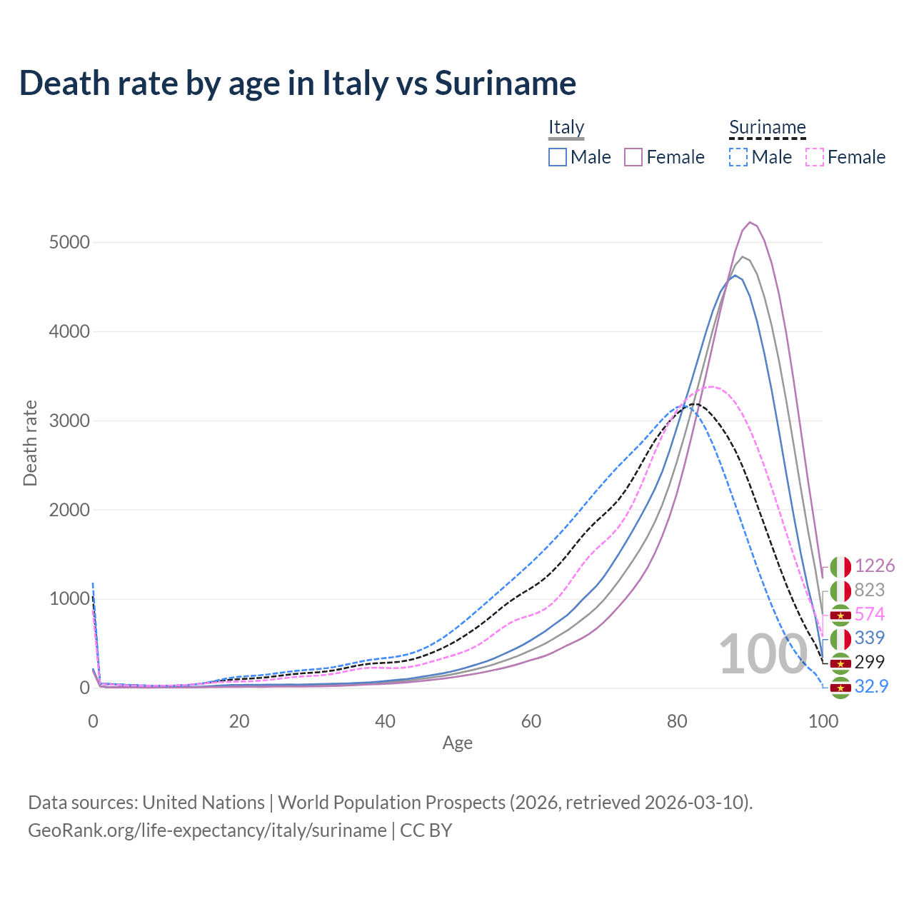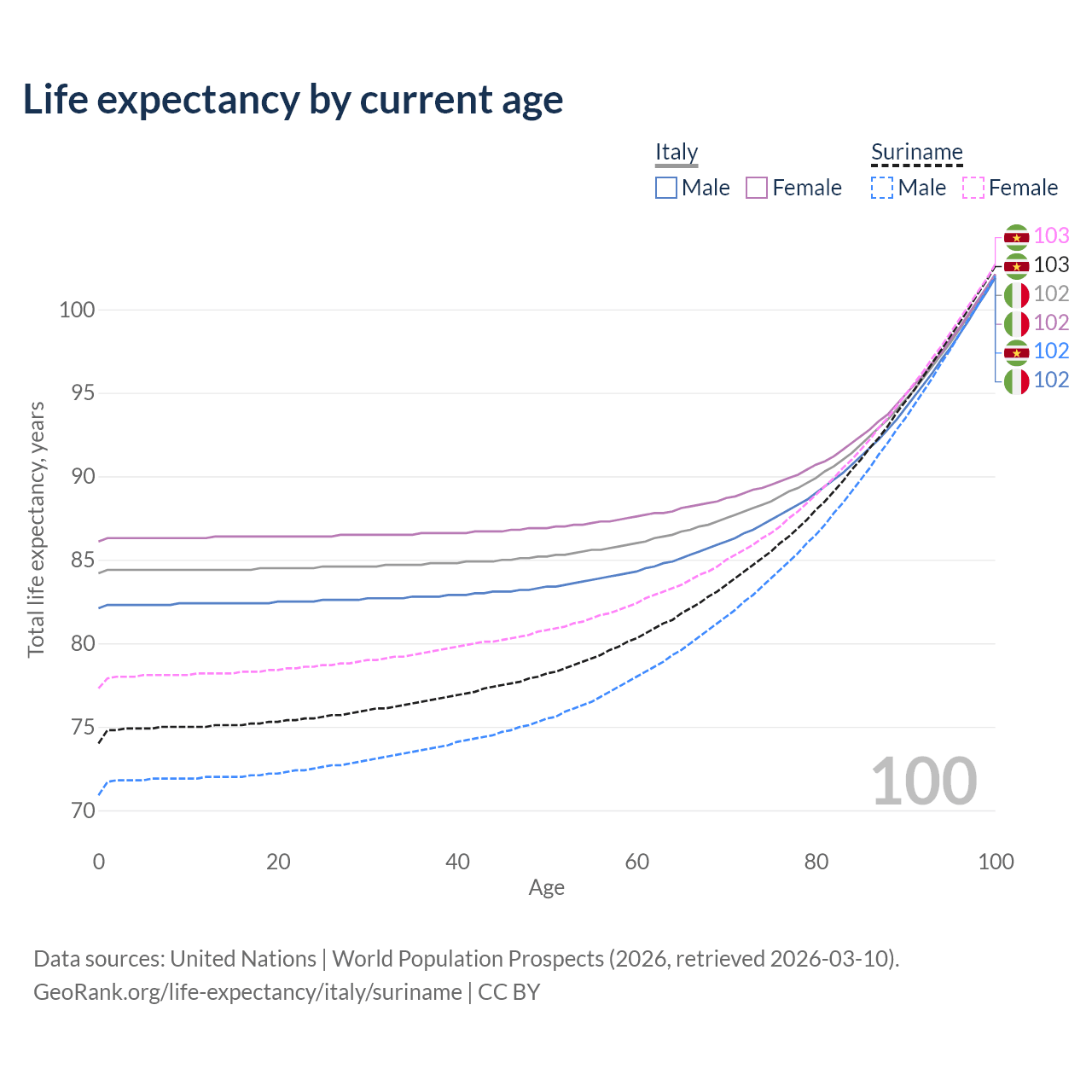 This life expectancy calculator shows the odds of living to 100, 95, 90, and below based on current age for both males and females in Italy and Suriname, along with mean and median age of death. The calculations are based on the 2026 life tables (actuarial tables) from the UN World Population Prospects.