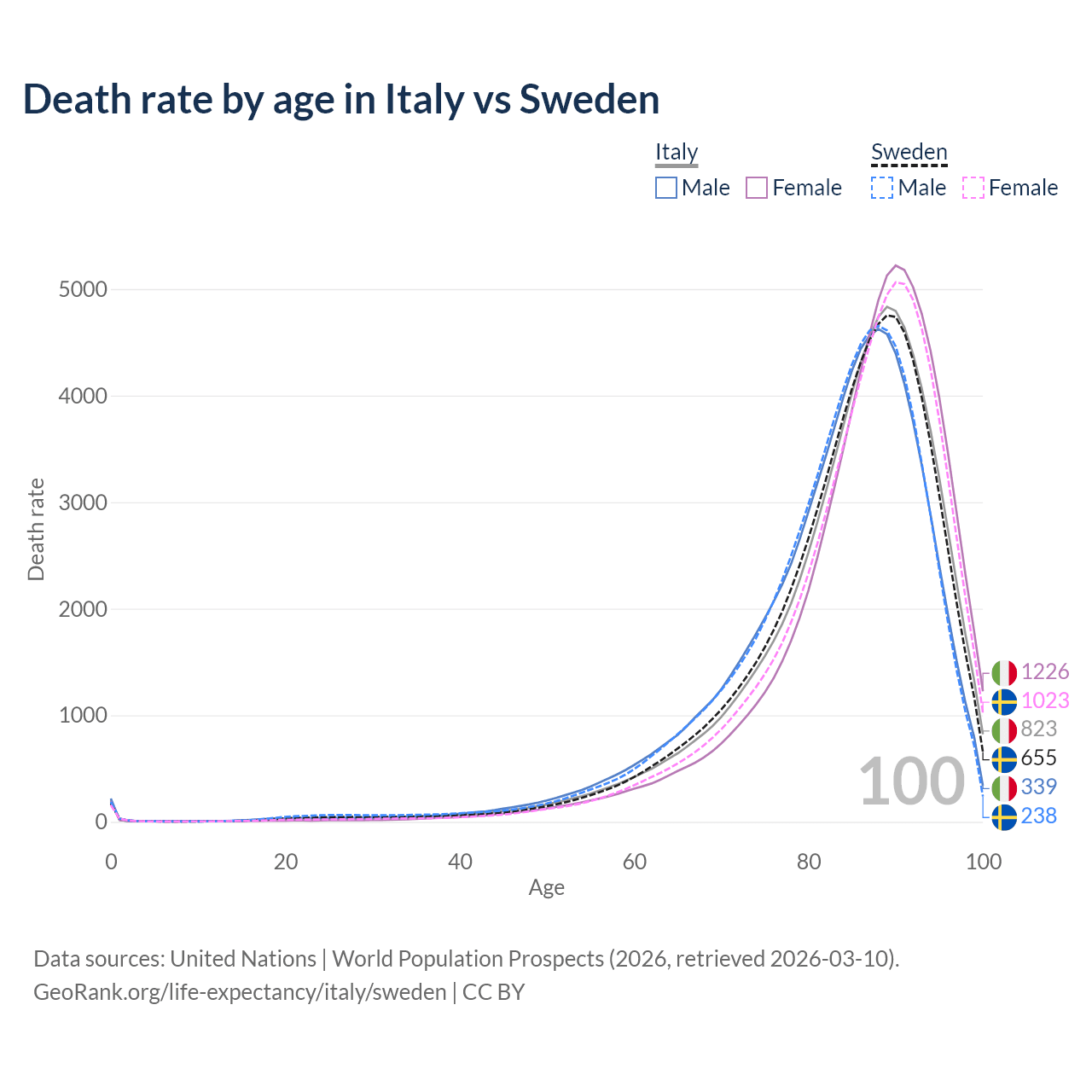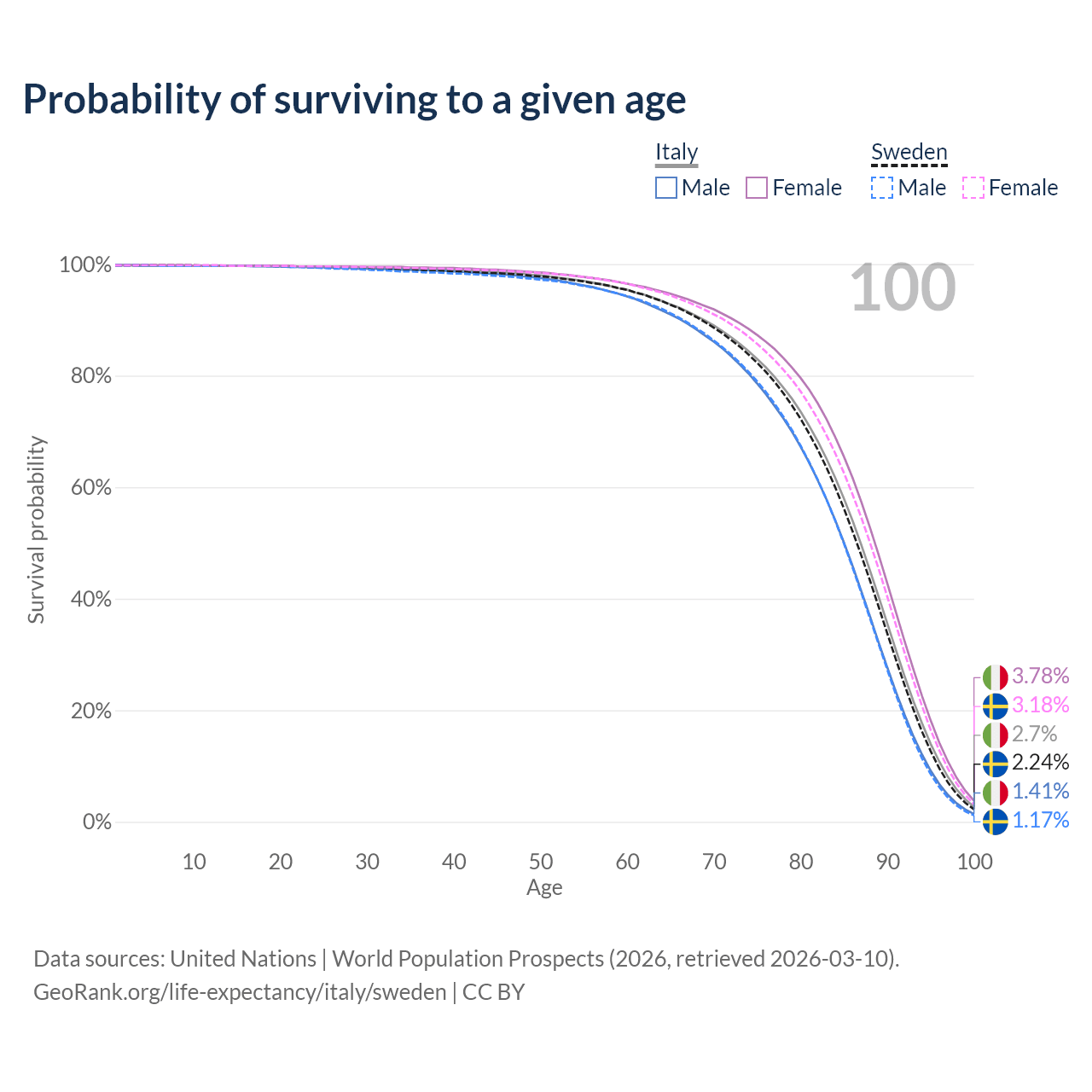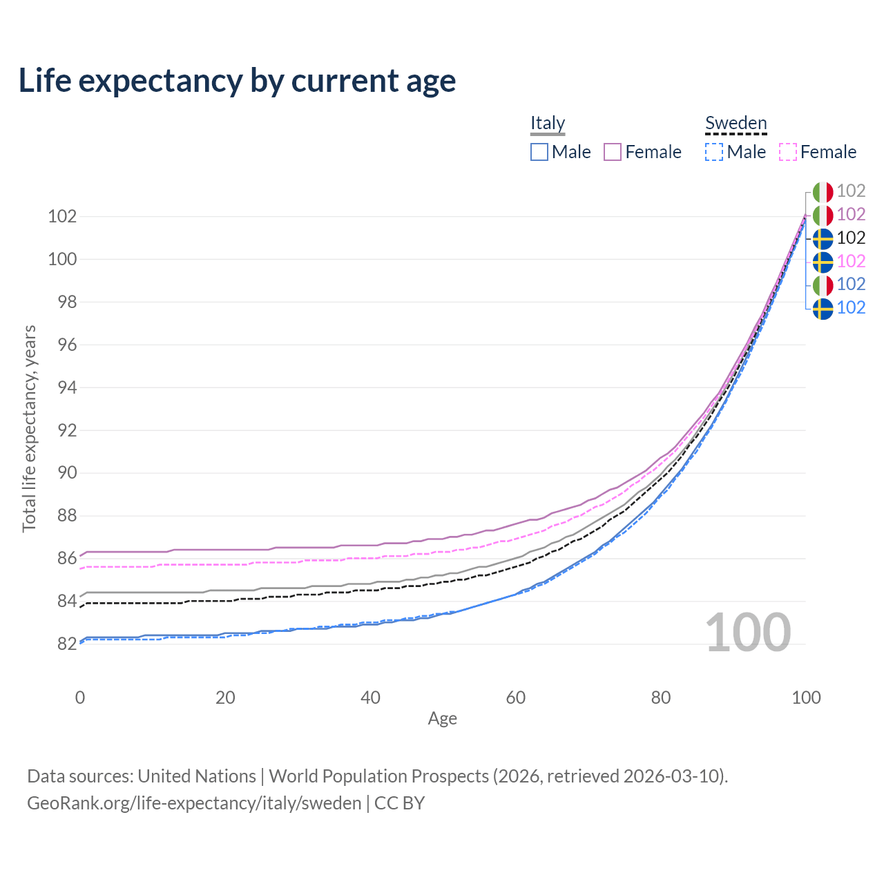 This life expectancy calculator shows the odds of living to 100, 95, 90, and below based on current age for both males and females in Italy and Sweden, along with mean and median age of death. The calculations are based on the 2026 life tables (actuarial tables) from the UN World Population Prospects.