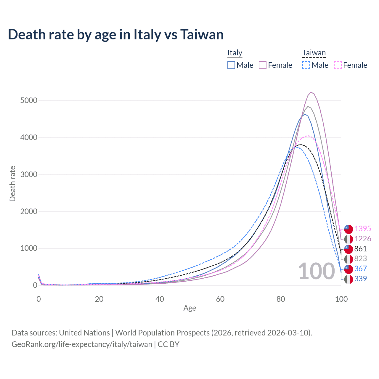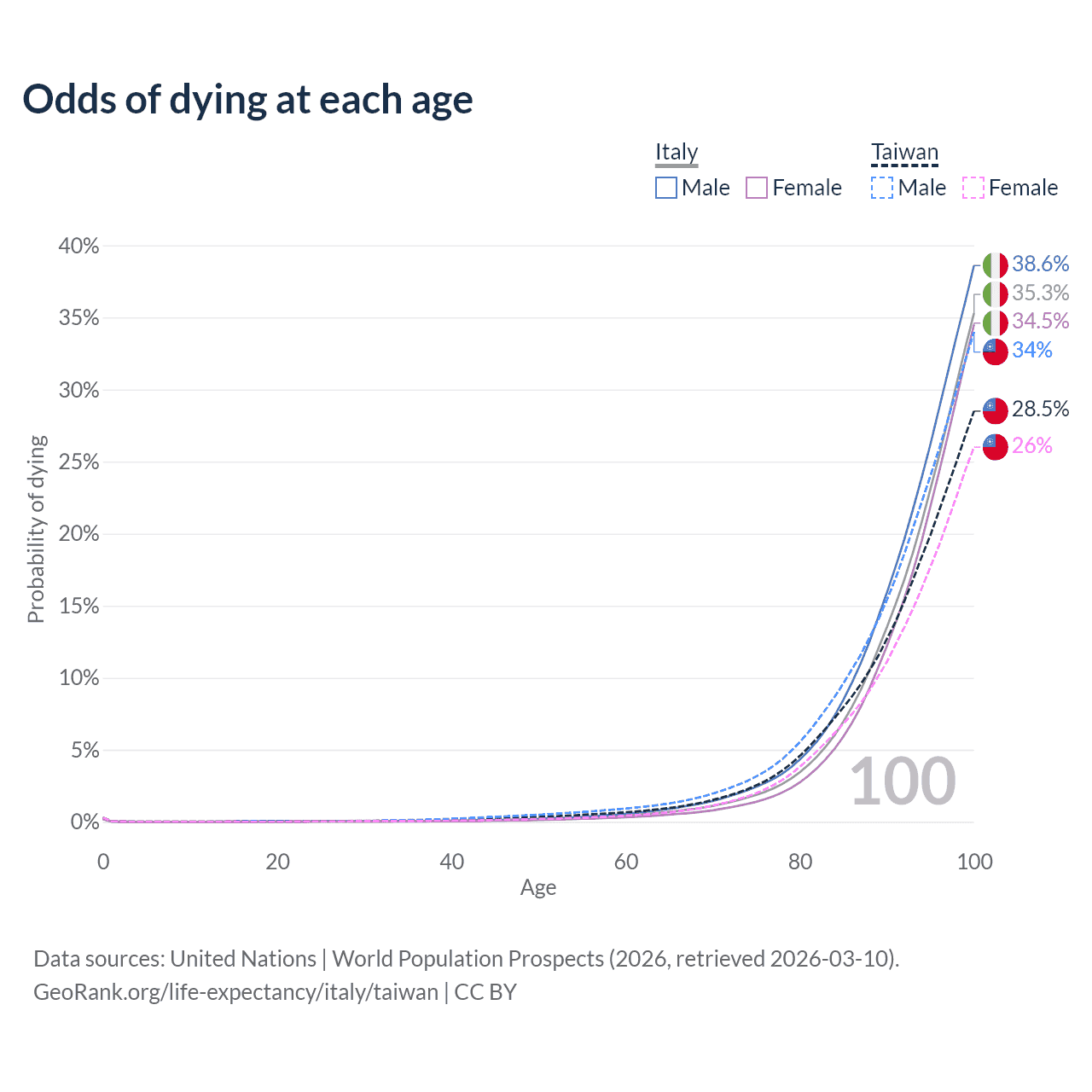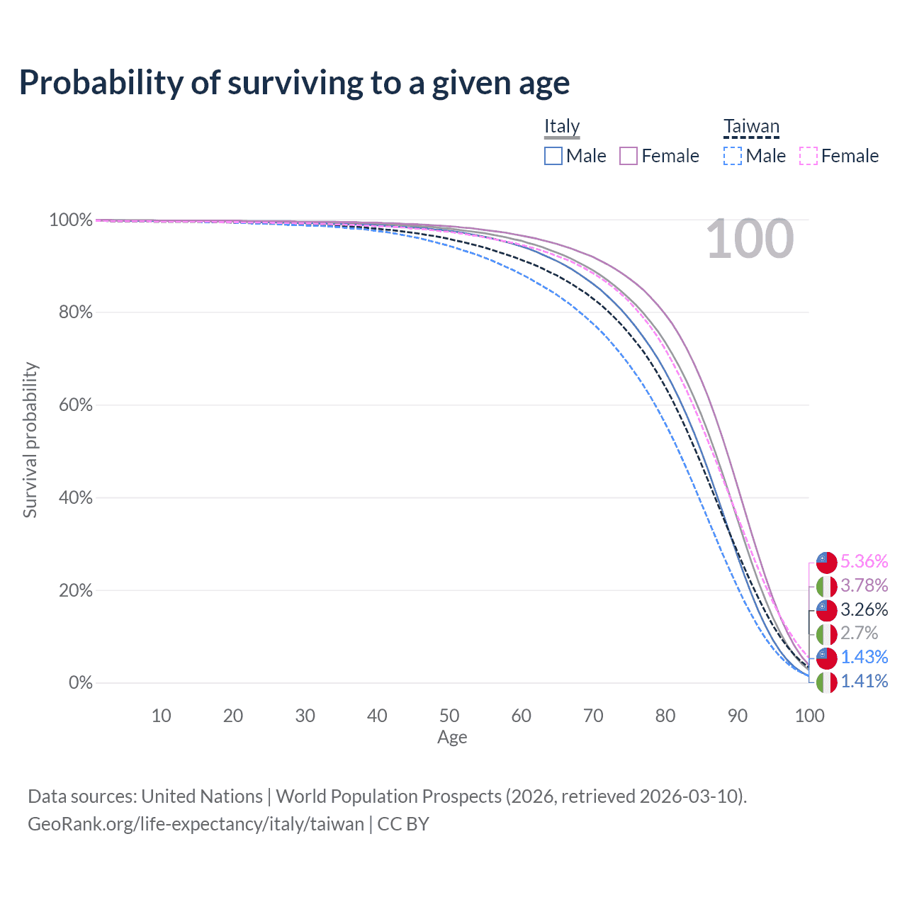 This life expectancy calculator shows the odds of living to 100, 95, 90, and below based on current age for both males and females in Italy and Taiwan, along with mean and median age of death. The calculations are based on the 2026 life tables (actuarial tables) from the UN World Population Prospects.