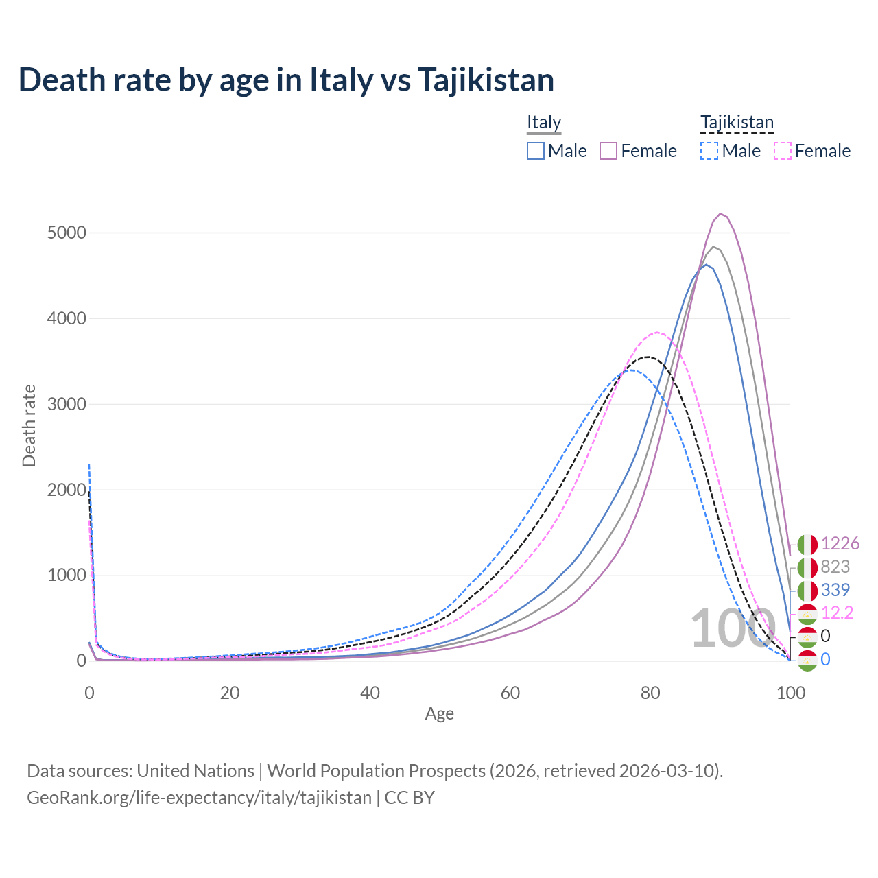 In Italy, the most common age of death is 89, compared to 80 in Tajikistan. The median age of death is 86.9 in Italy and 76 in Tajikistan, meaning only half of each cohort is expected to live past that age.