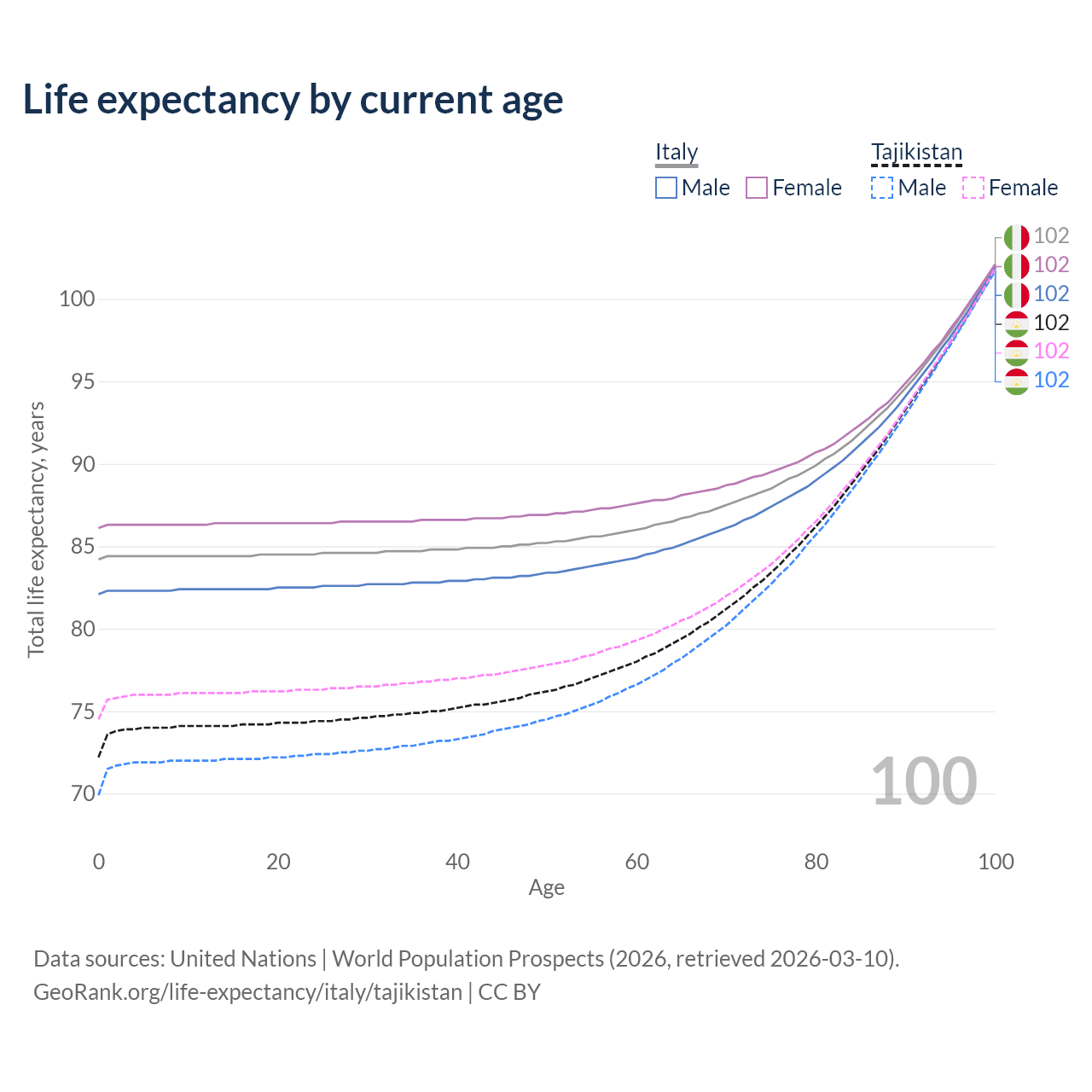 This life expectancy calculator shows the odds of living to 100, 95, 90, and below based on current age for both males and females in Italy and Tajikistan, along with mean and median age of death. The calculations are based on the 2026 life tables (actuarial tables) from the UN World Population Prospects.