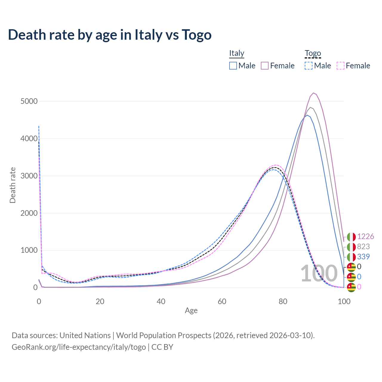 In Italy, the most common age of death is 89, compared to 0 in Togo. The median age of death is 86.9 in Italy and 71 in Togo, meaning only half of each cohort is expected to live past that age.