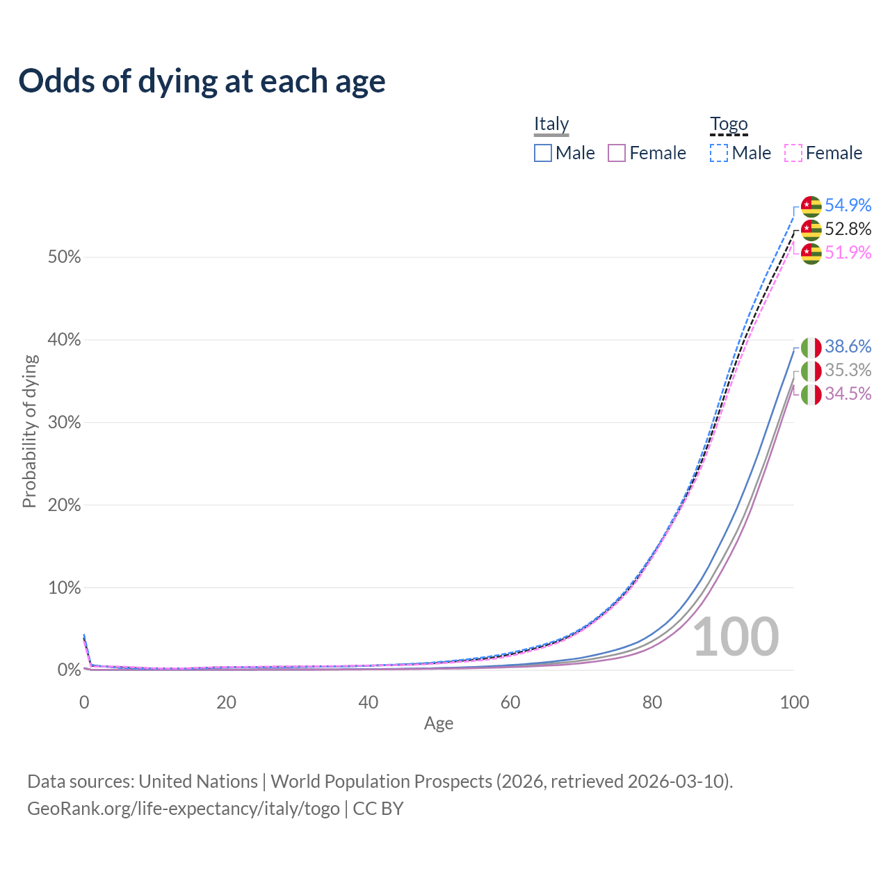 This life expectancy calculator shows the odds of living to 100, 95, 90, and below based on current age for both males and females in Italy and Togo, along with mean and median age of death. The calculations are based on the 2026 life tables (actuarial tables) from the UN World Population Prospects.