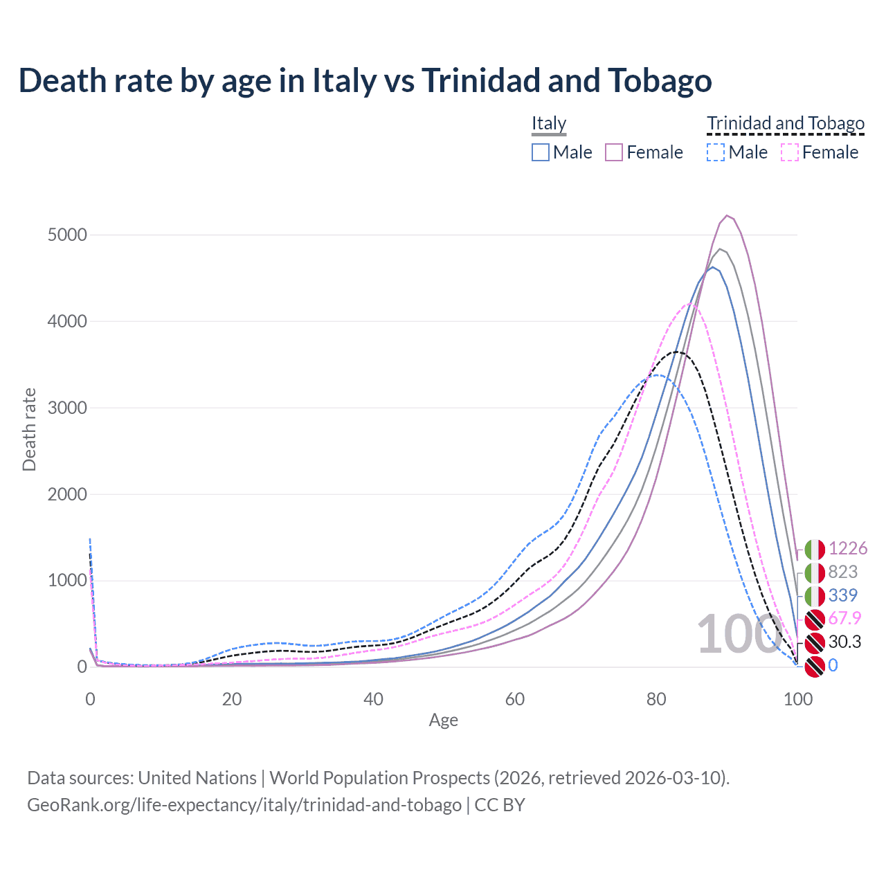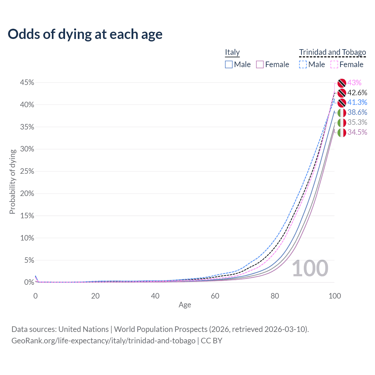 This life expectancy calculator shows the odds of living to 100, 95, 90, and below based on current age for both males and females in Italy and Trinidad and Tobago, along with mean and median age of death. The calculations are based on the 2026 life tables (actuarial tables) from the UN World Population Prospects.