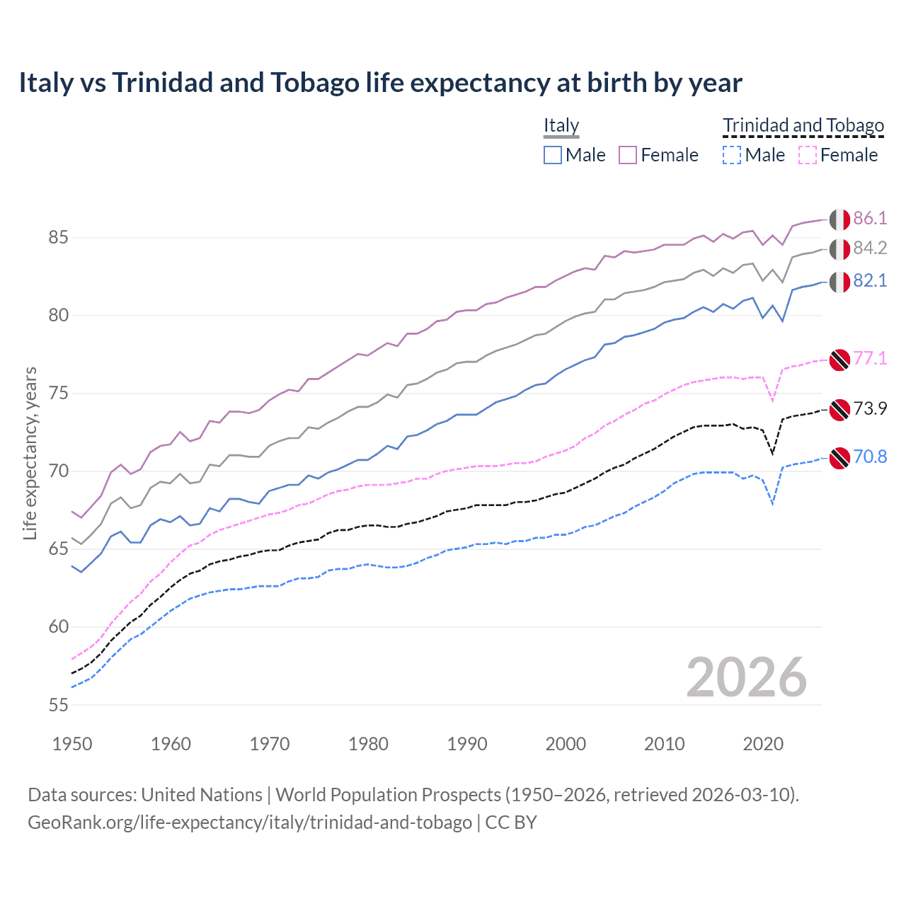 The average life expectancy at birth is 84.2 years in Italy vs 73.9 in Trinidad and Tobago. Italy is ranked 8/197 by life expectancy, and Trinidad and Tobago is 105/197. In Italy, the life expectancy is 82.1 years for males and 86.1 years for females. In Trinidad and Tobago, it's 70.8 years for males and 77.1 years for females.