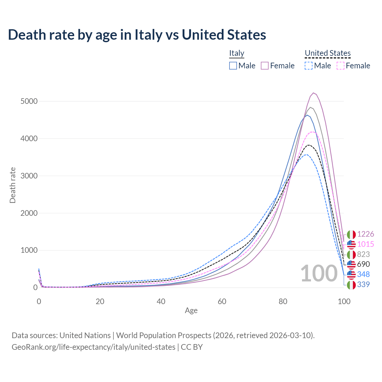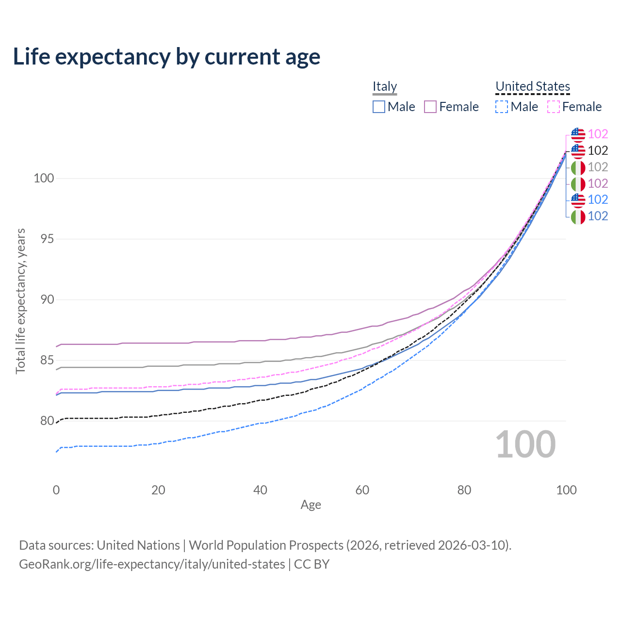 This life expectancy calculator shows the odds of living to 100, 95, 90, and below based on current age for both males and females in Italy and the United States, along with mean and median age of death. The calculations are based on the 2026 life tables (actuarial tables) from the UN World Population Prospects.