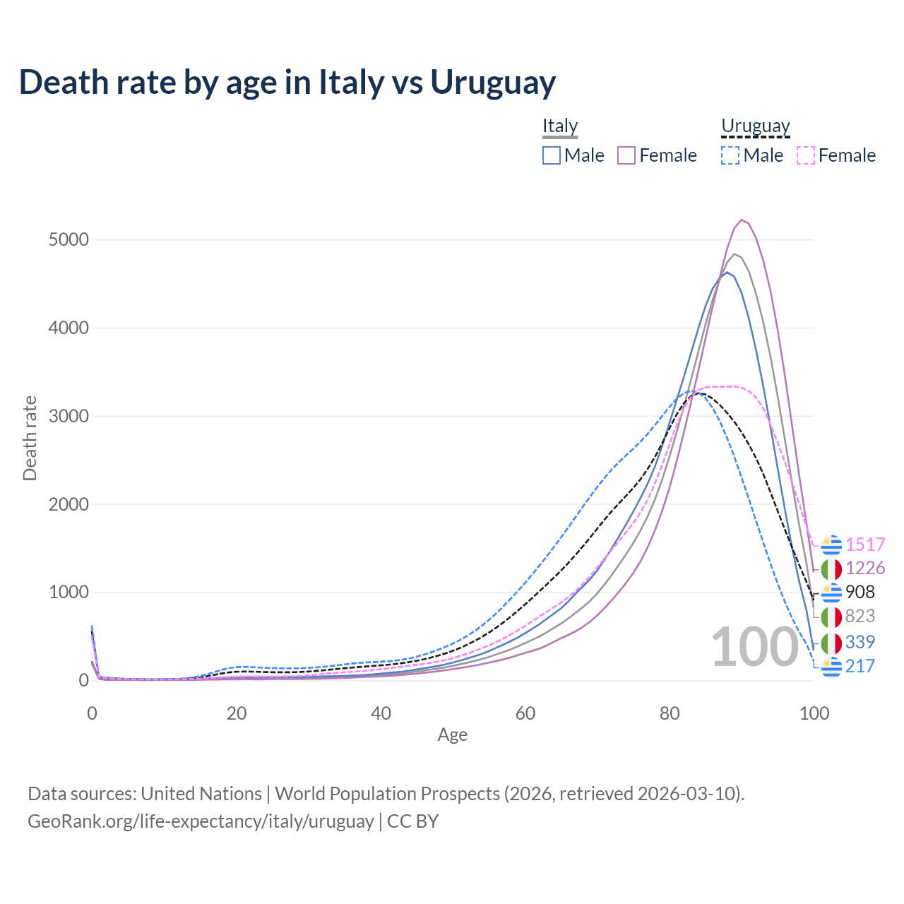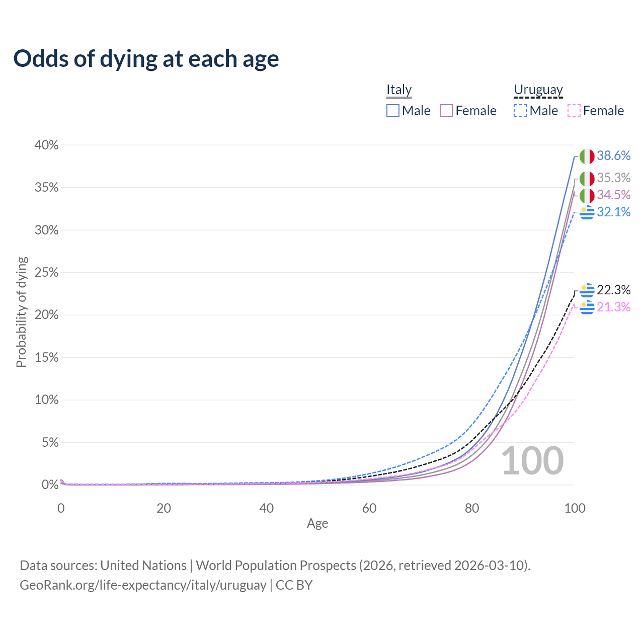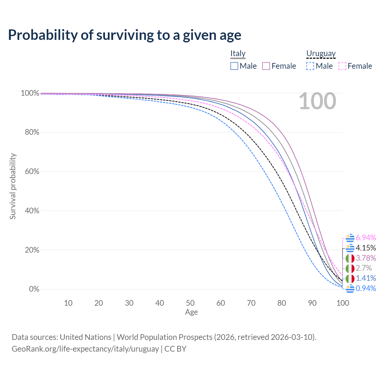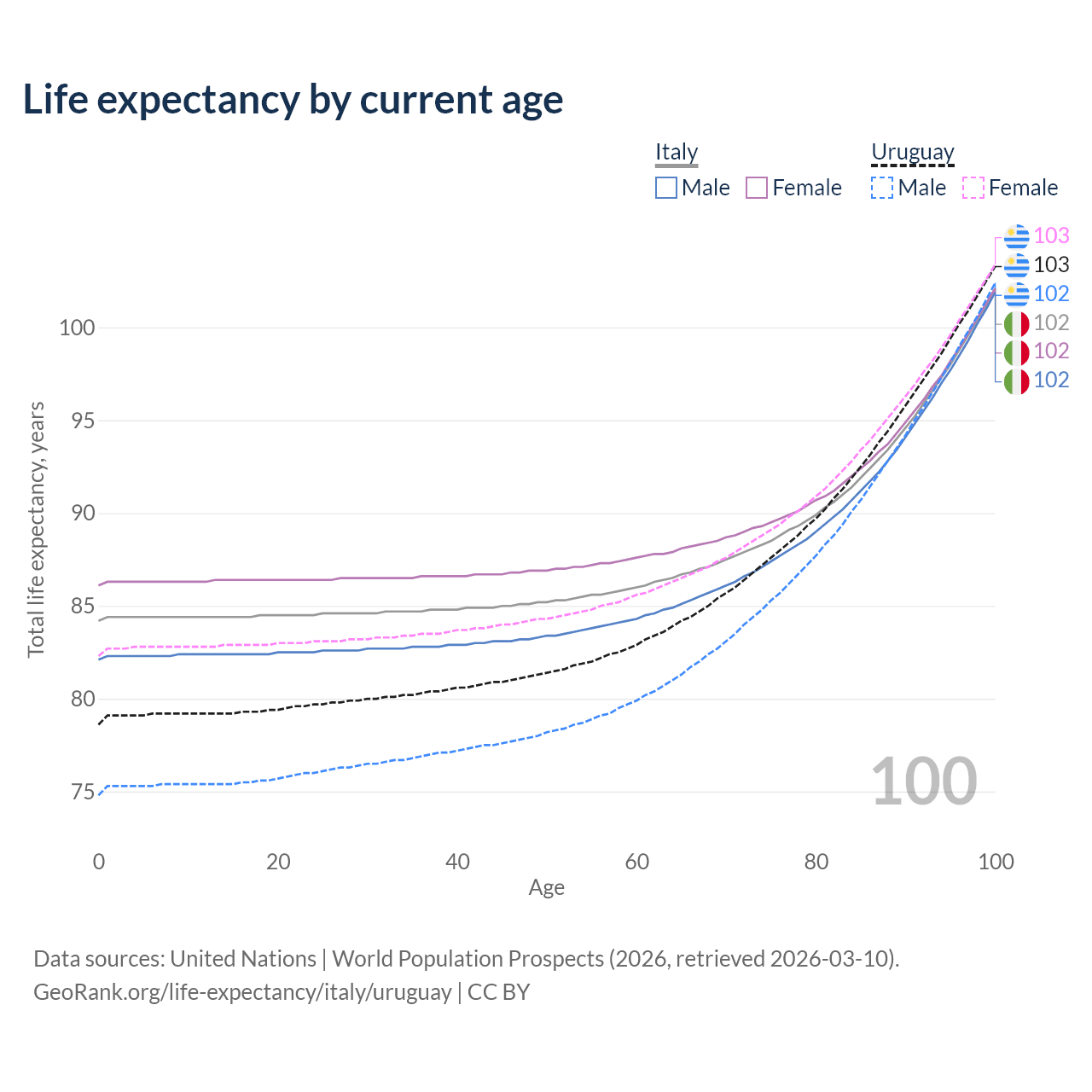 This life expectancy calculator shows the odds of living to 100, 95, 90, and below based on current age for both males and females in Italy and Uruguay, along with mean and median age of death. The calculations are based on the 2026 life tables (actuarial tables) from the UN World Population Prospects.