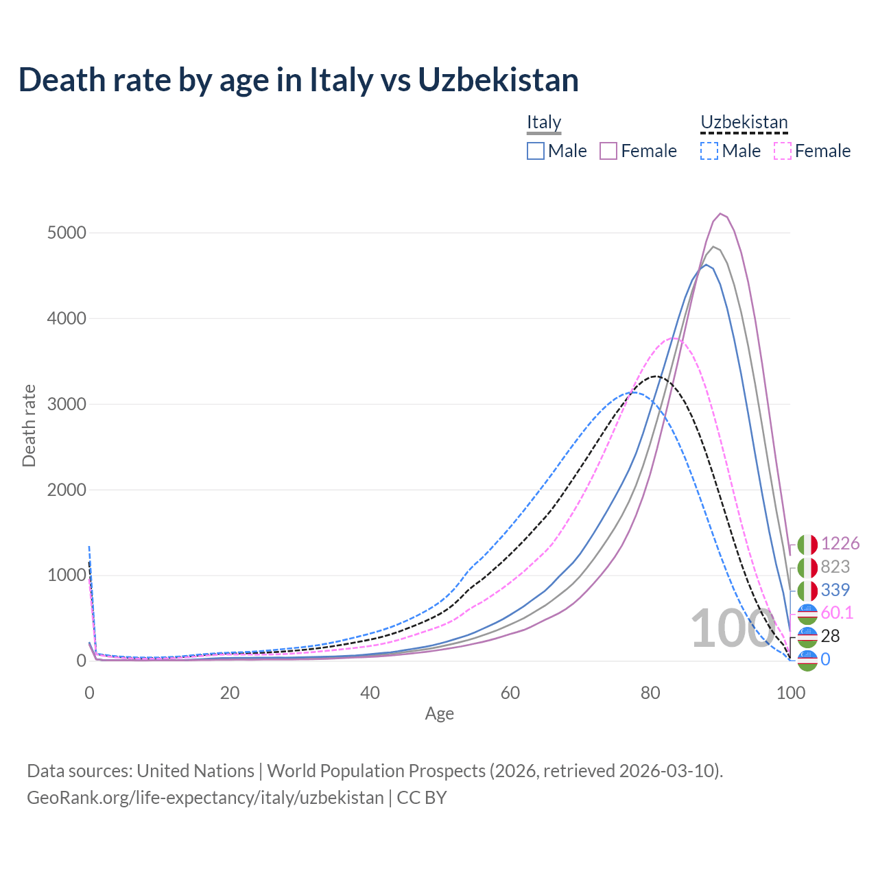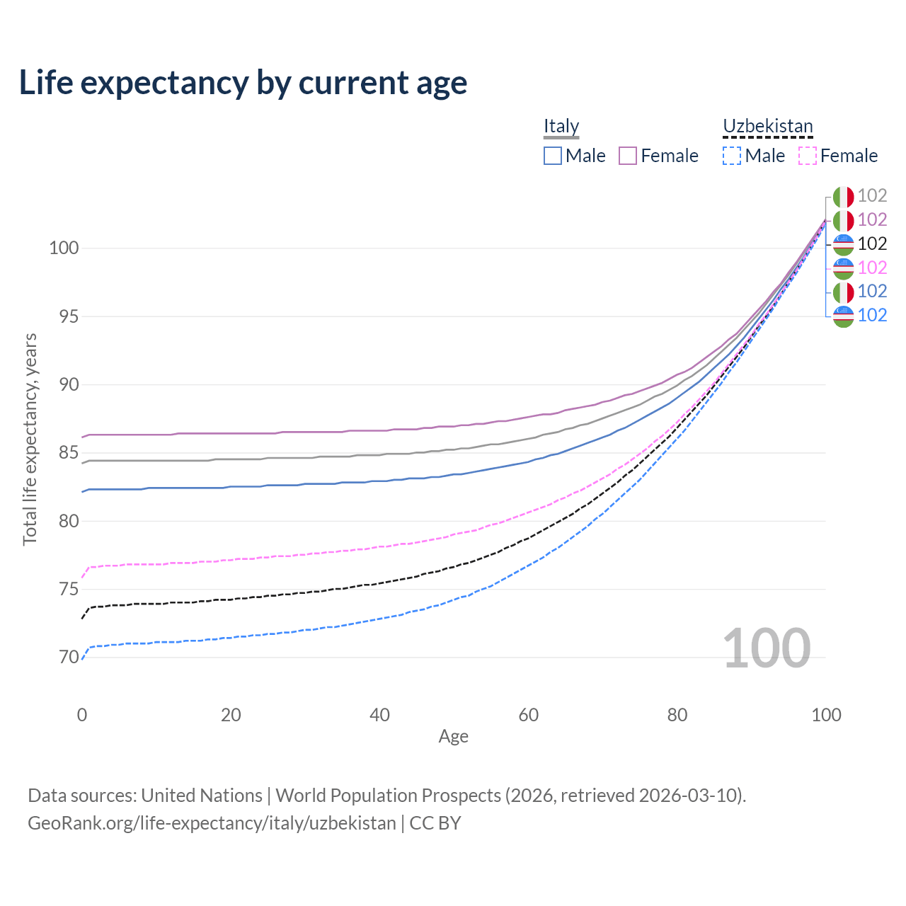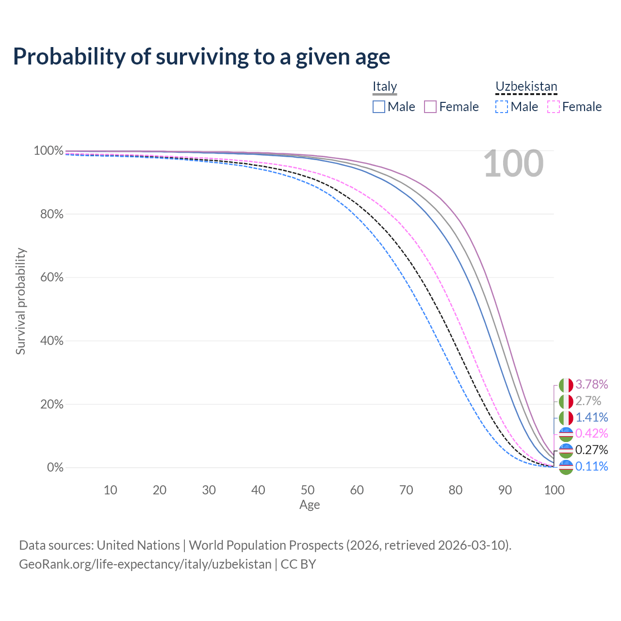 This life expectancy calculator shows the odds of living to 100, 95, 90, and below based on current age for both males and females in Italy and Uzbekistan, along with mean and median age of death. The calculations are based on the 2026 life tables (actuarial tables) from the UN World Population Prospects.