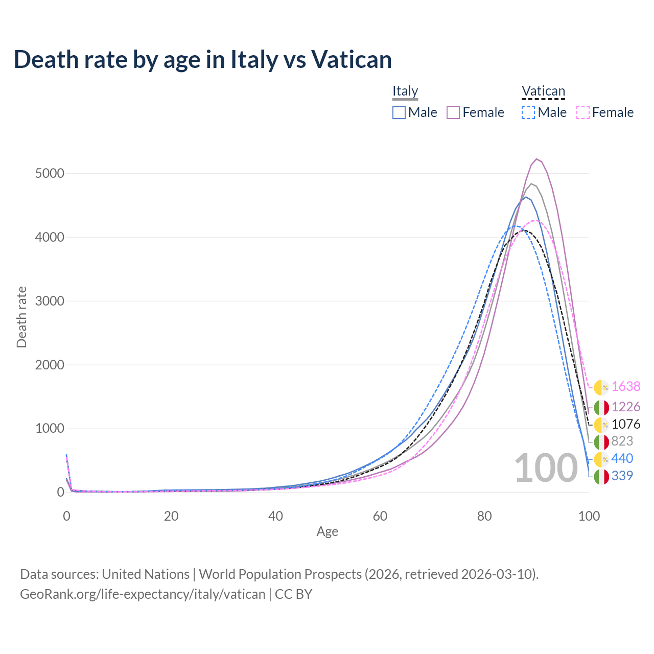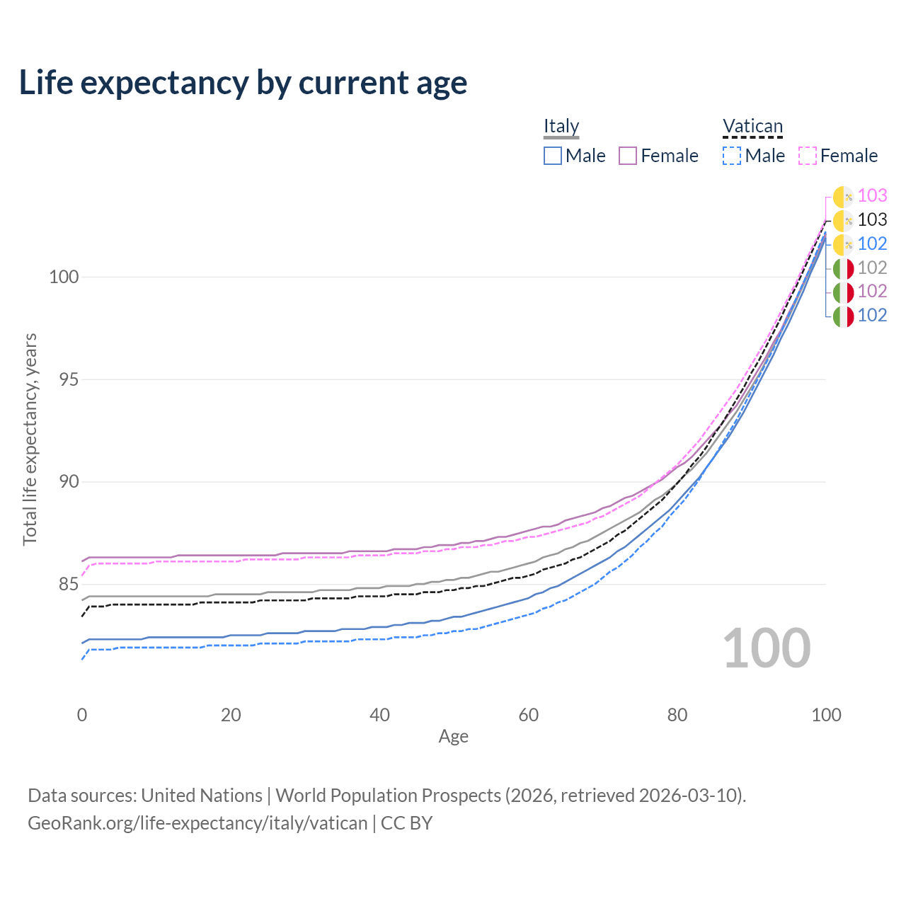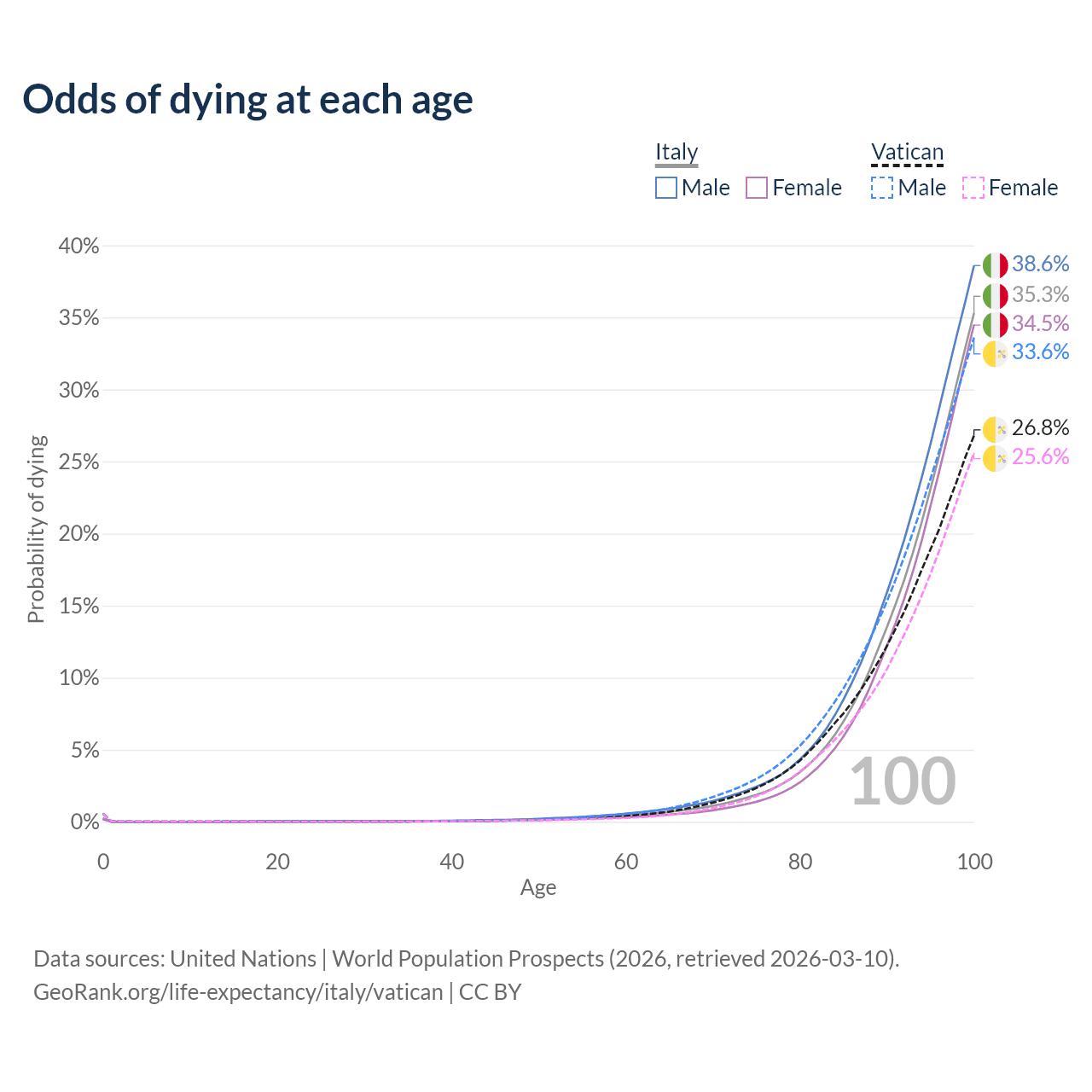 This life expectancy calculator shows the odds of living to 100, 95, 90, and below based on current age for both males and females in Italy and the Vatican, along with mean and median age of death. The calculations are based on the 2026 life tables (actuarial tables) from the UN World Population Prospects.