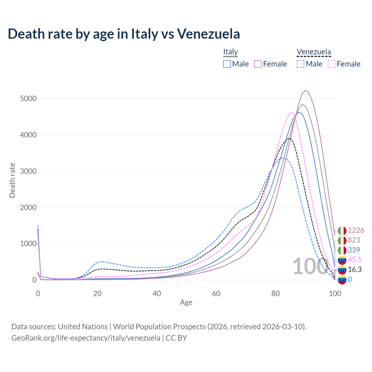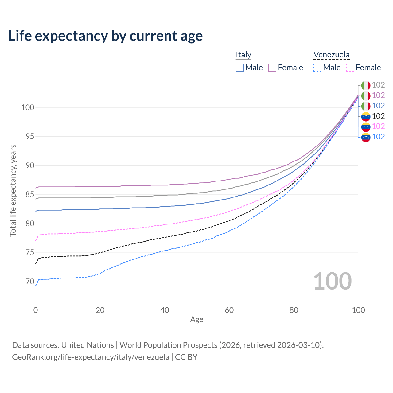 This life expectancy calculator shows the odds of living to 100, 95, 90, and below based on current age for both males and females in Italy and Venezuela, along with mean and median age of death. The calculations are based on the 2026 life tables (actuarial tables) from the UN World Population Prospects.