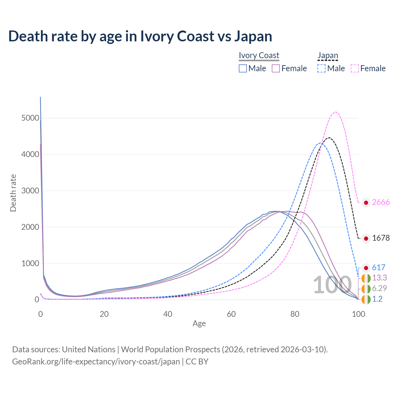 In Ivory Coast, the most common age of death is 0, compared to 91 in Japan. The median age of death is 68.6 in Ivory Coast and 88.1 in Japan, meaning only half of each cohort is expected to live past that age.