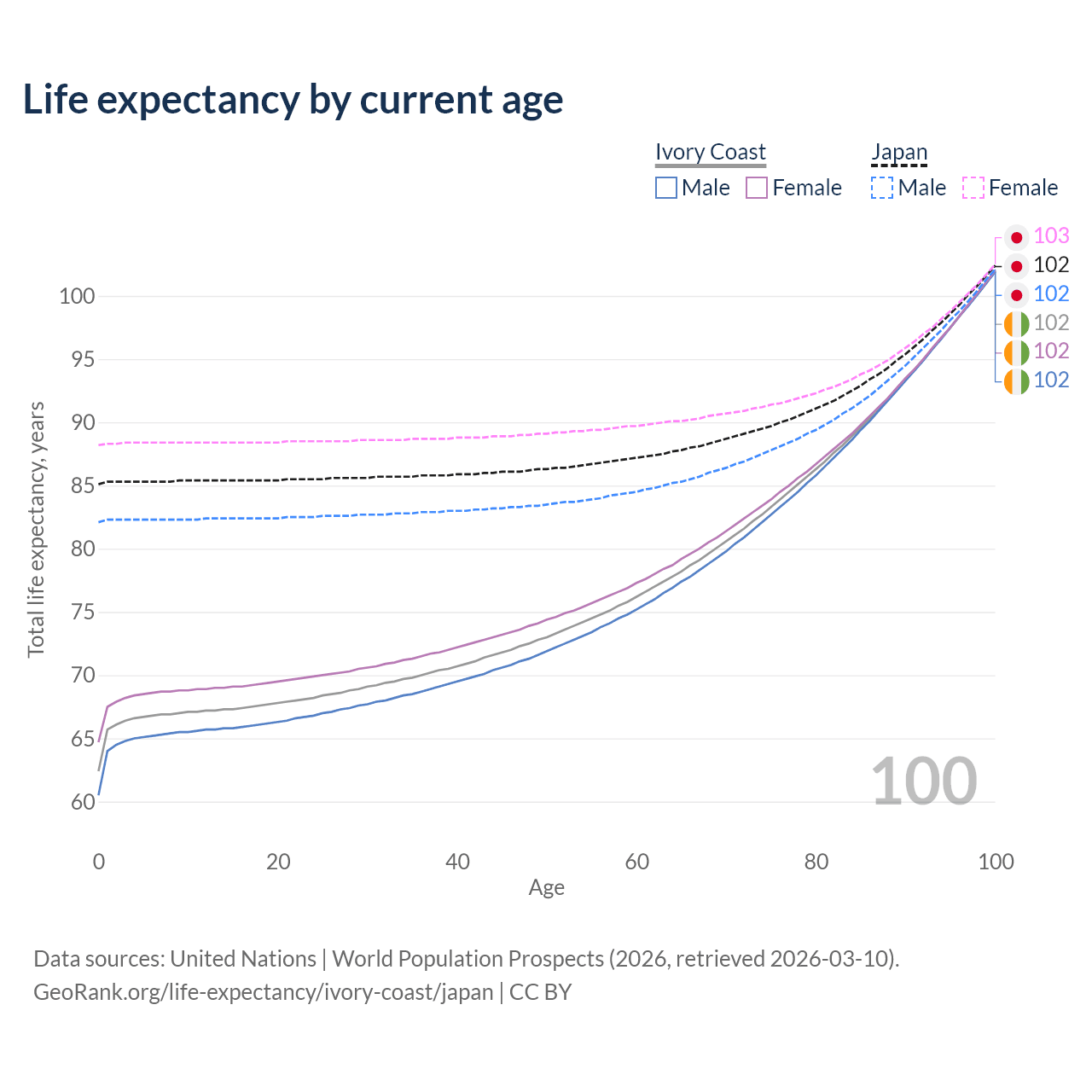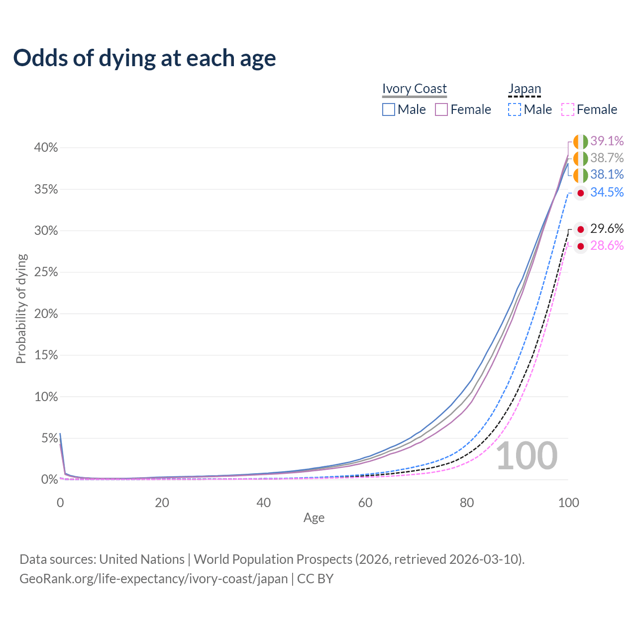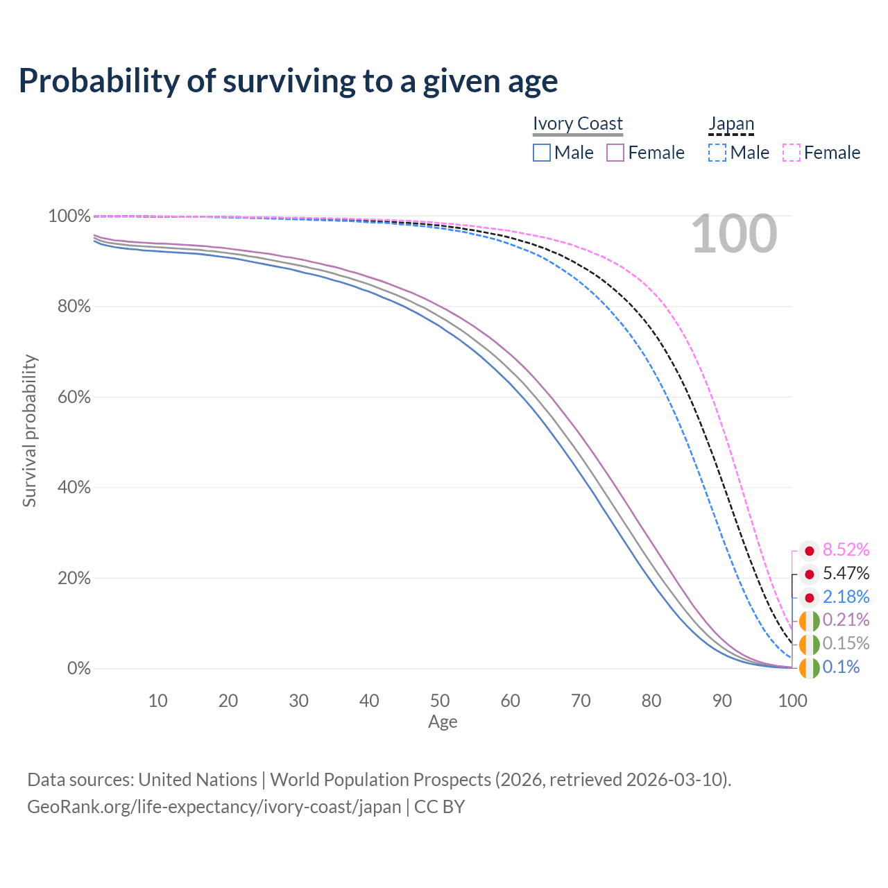 This life expectancy calculator shows the odds of living to 100, 95, 90, and below based on current age for both males and females in Ivory Coast and Japan, along with mean and median age of death. The calculations are based on the 2026 life tables (actuarial tables) from the UN World Population Prospects.