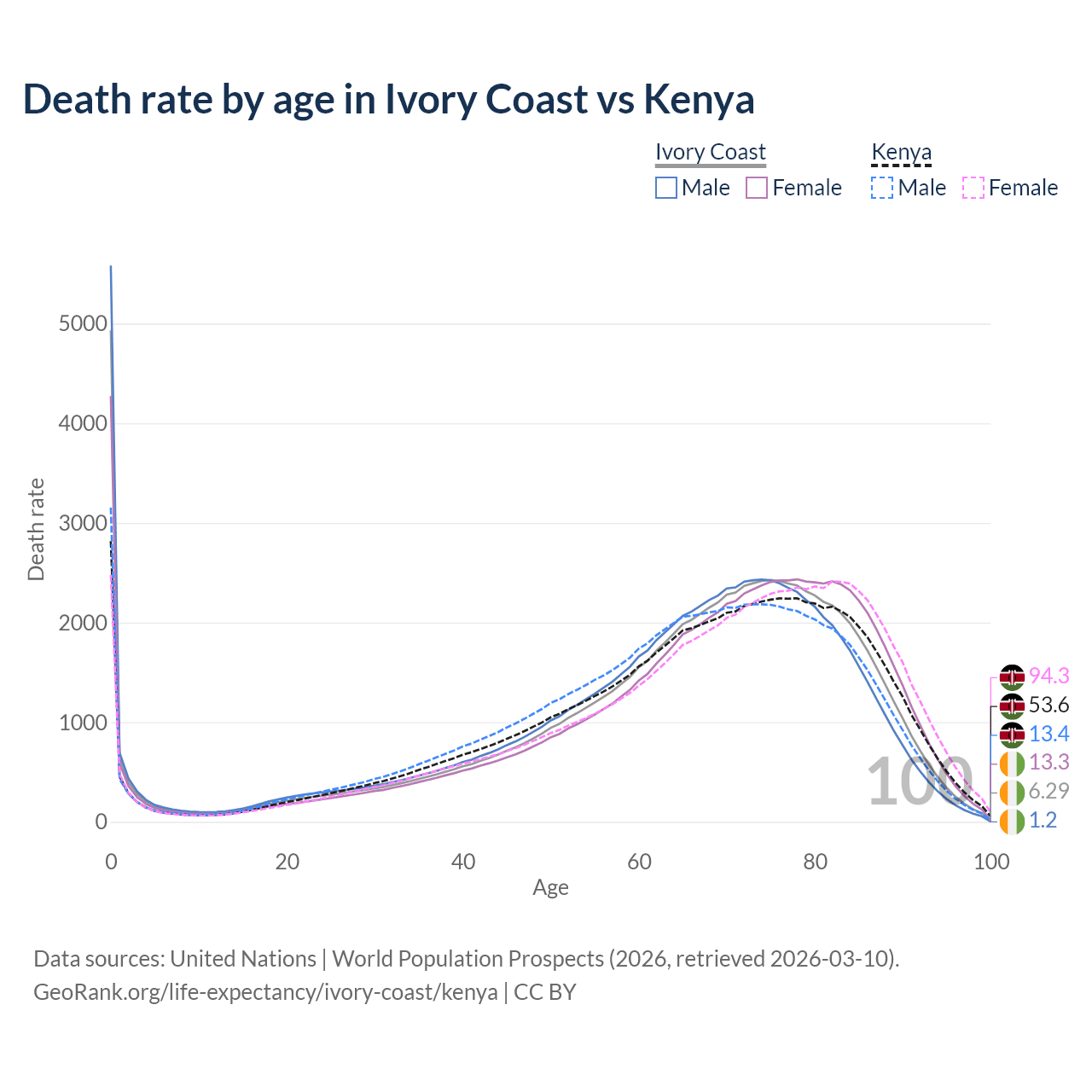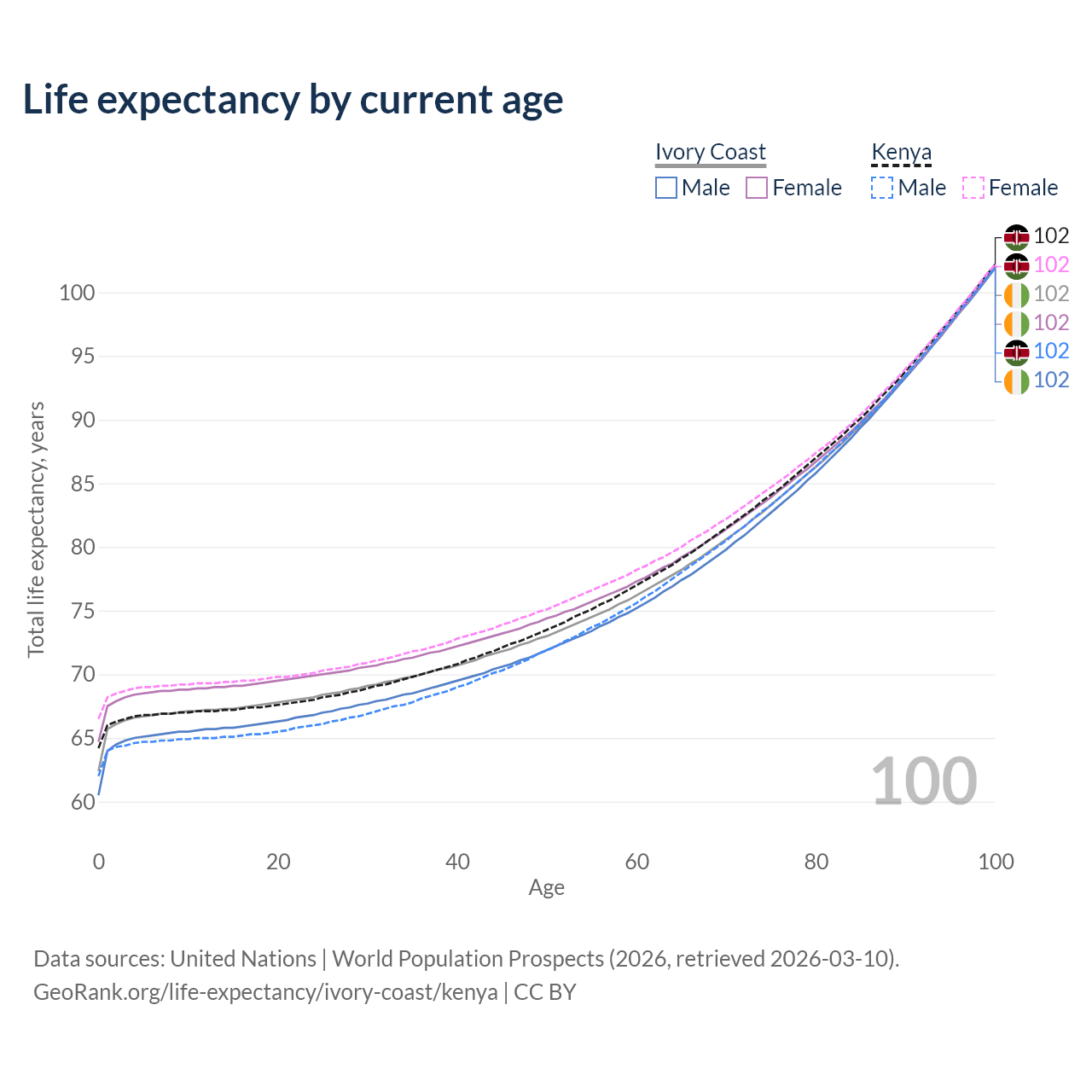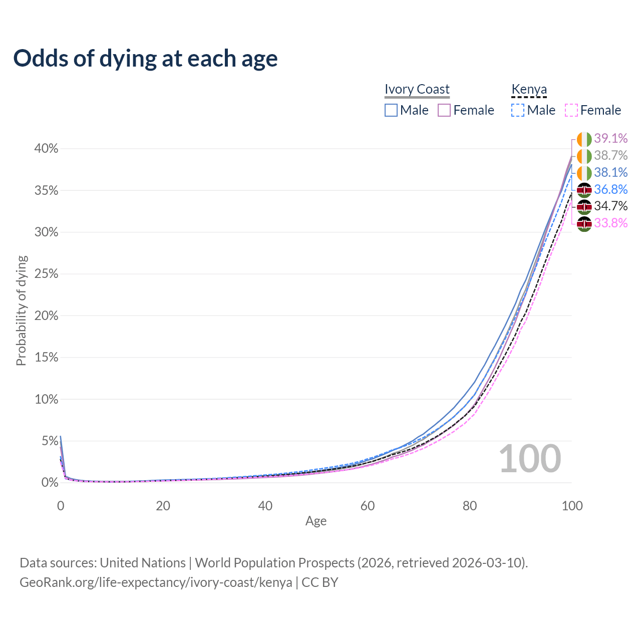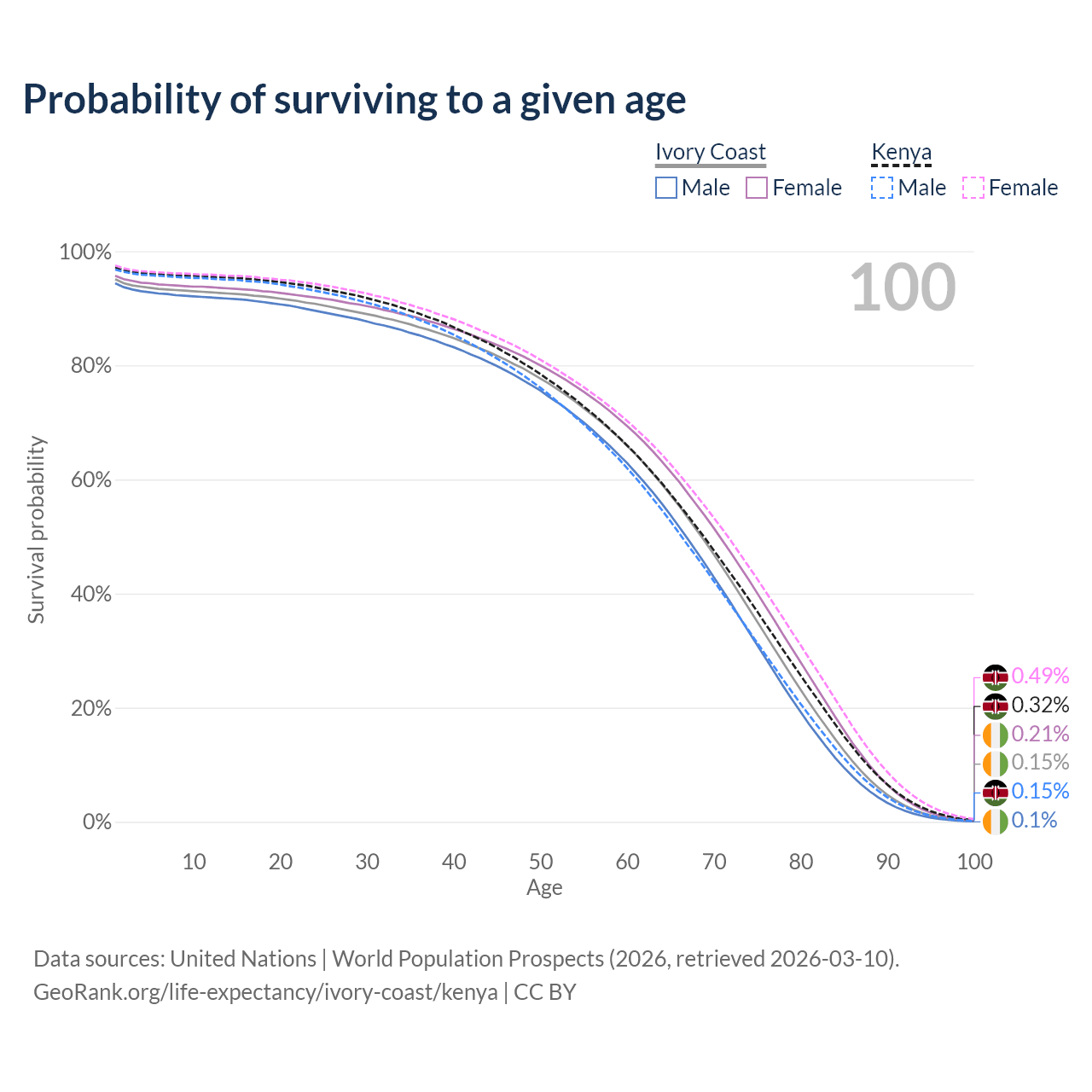 This life expectancy calculator shows the odds of living to 100, 95, 90, and below based on current age for both males and females in Ivory Coast and Kenya, along with mean and median age of death. The calculations are based on the 2026 life tables (actuarial tables) from the UN World Population Prospects.