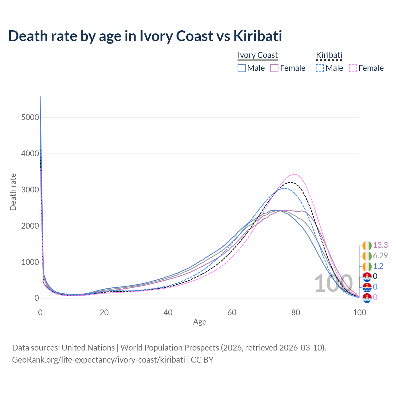 In Ivory Coast, the most common age of death is 0, compared to 0 in Kiribati. The median age of death is 68.6 in Ivory Coast and 73.1 in Kiribati, meaning only half of each cohort is expected to live past that age.