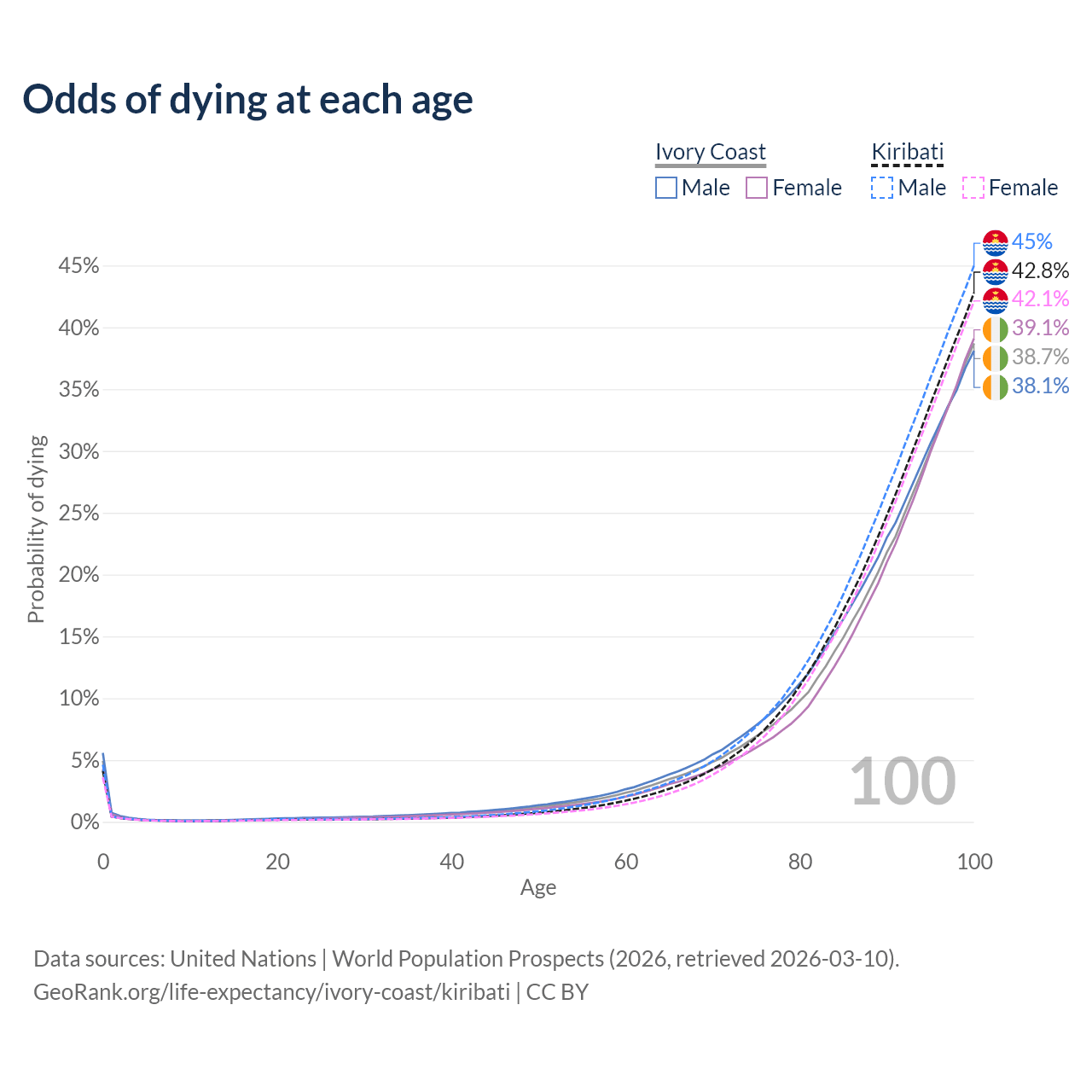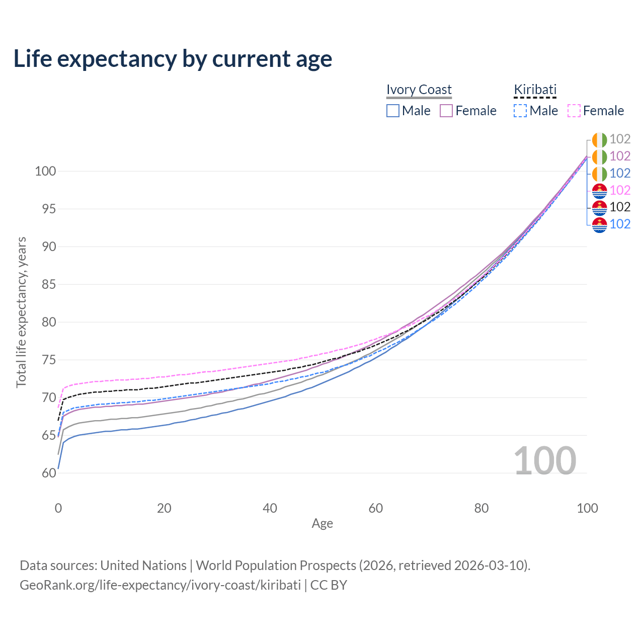 This life expectancy calculator shows the odds of living to 100, 95, 90, and below based on current age for both males and females in Ivory Coast and Kiribati, along with mean and median age of death. The calculations are based on the 2026 life tables (actuarial tables) from the UN World Population Prospects.
