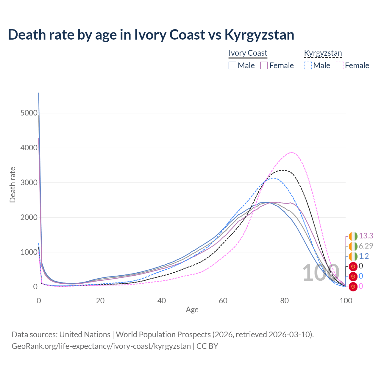 In Ivory Coast, the most common age of death is 0, compared to 79 in Kyrgyzstan. The median age of death is 68.6 in Ivory Coast and 75.6 in Kyrgyzstan, meaning only half of each cohort is expected to live past that age.