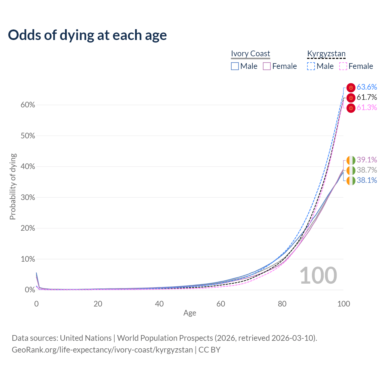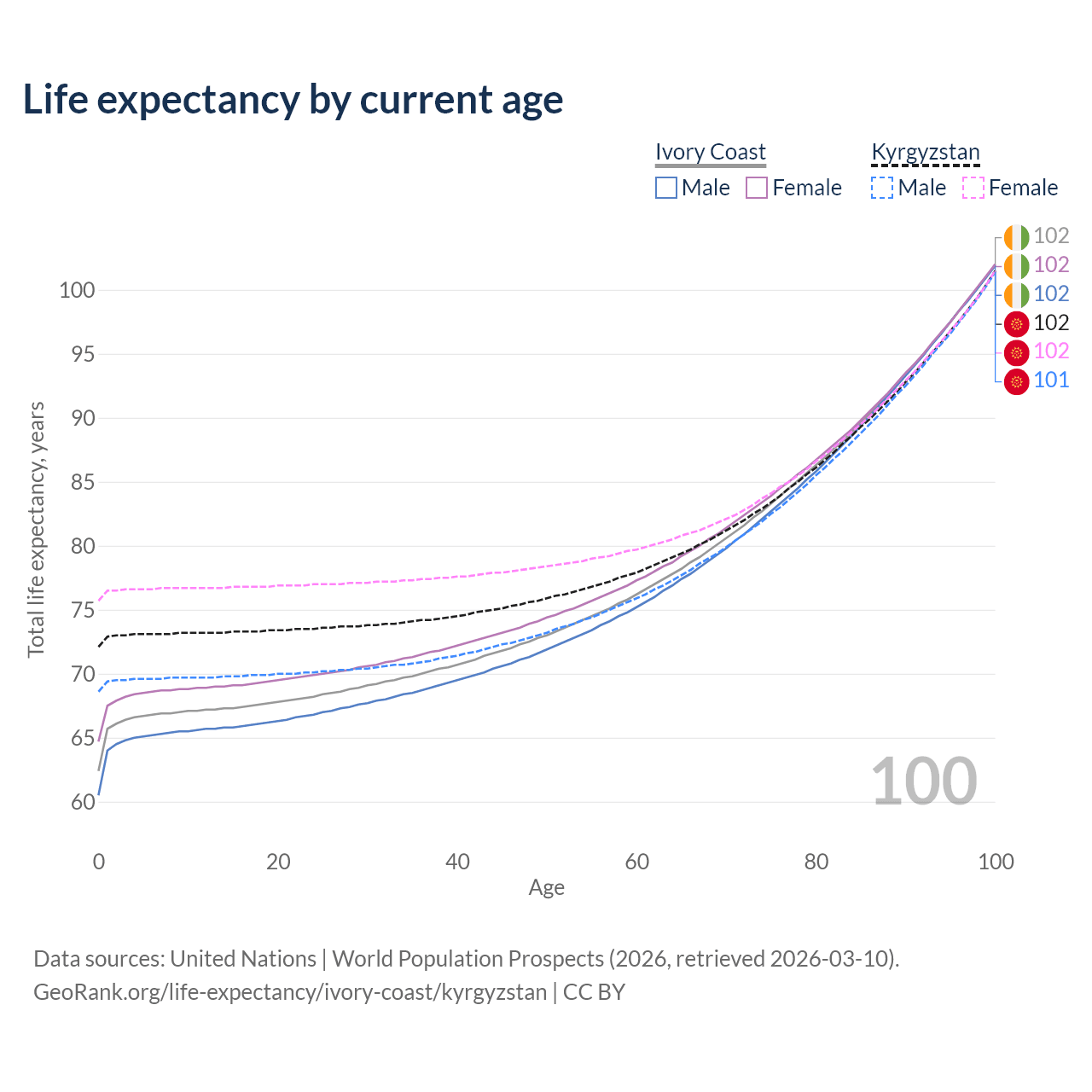 This life expectancy calculator shows the odds of living to 100, 95, 90, and below based on current age for both males and females in Ivory Coast and Kyrgyzstan, along with mean and median age of death. The calculations are based on the 2026 life tables (actuarial tables) from the UN World Population Prospects.