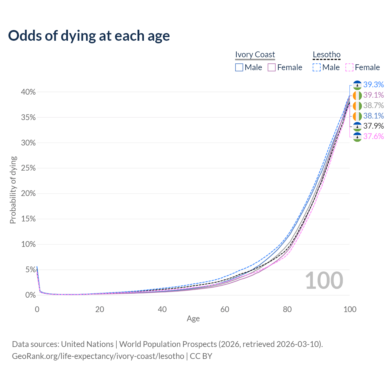 This life expectancy calculator shows the odds of living to 100, 95, 90, and below based on current age for both males and females in Ivory Coast and Lesotho, along with mean and median age of death. The calculations are based on the 2026 life tables (actuarial tables) from the UN World Population Prospects.
