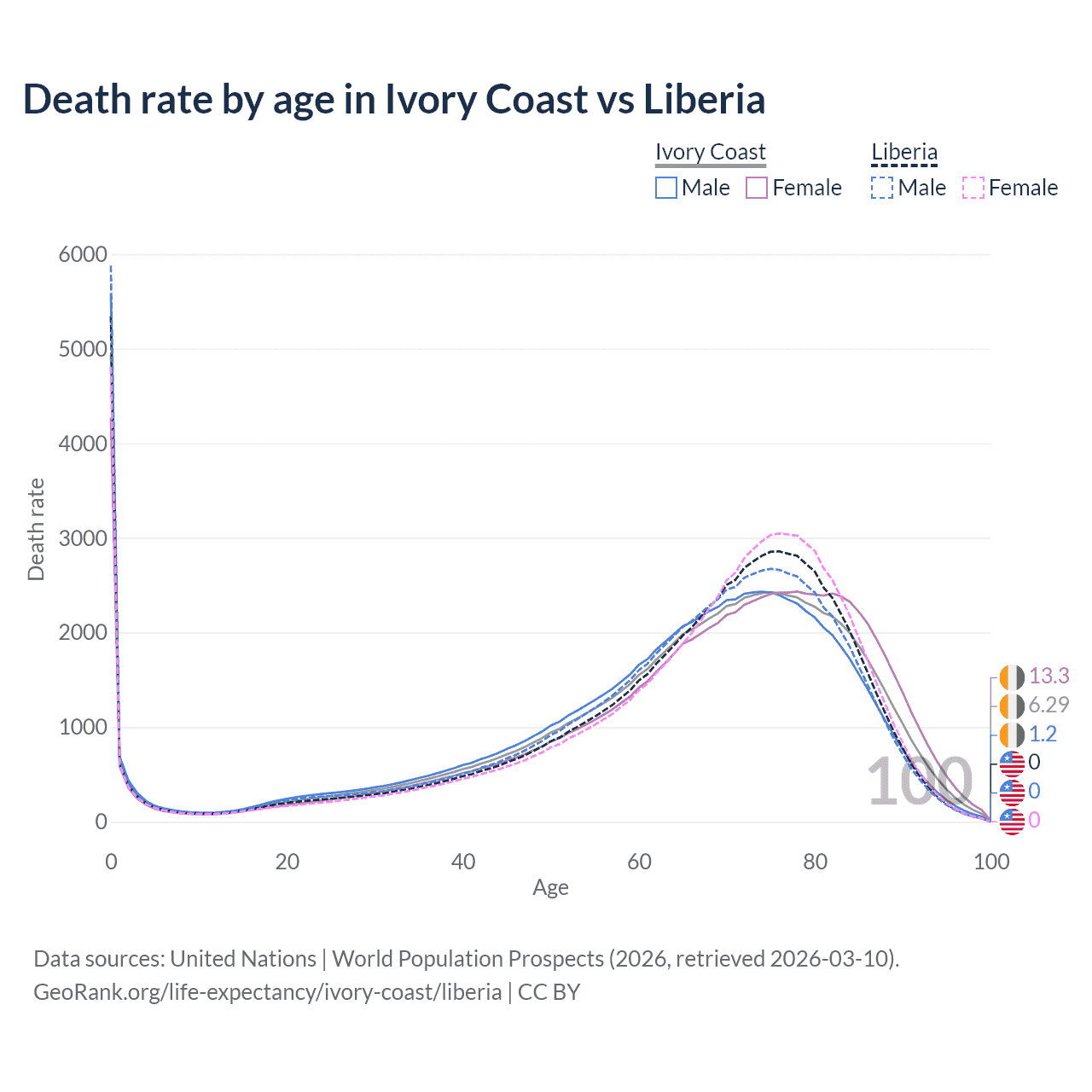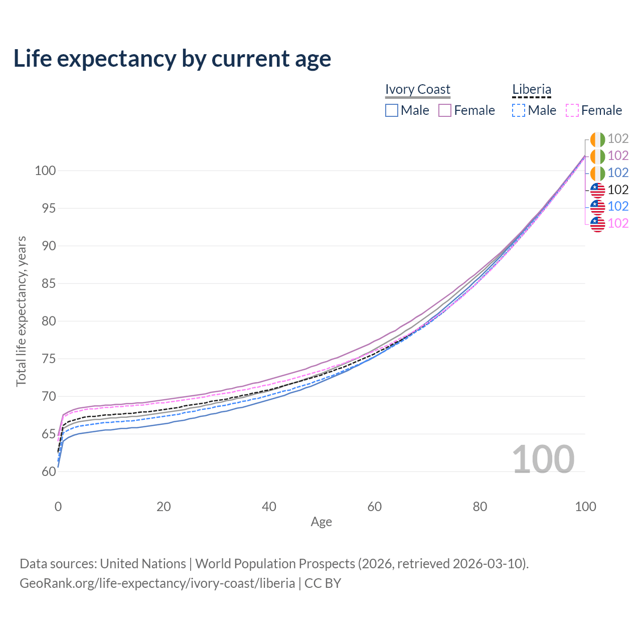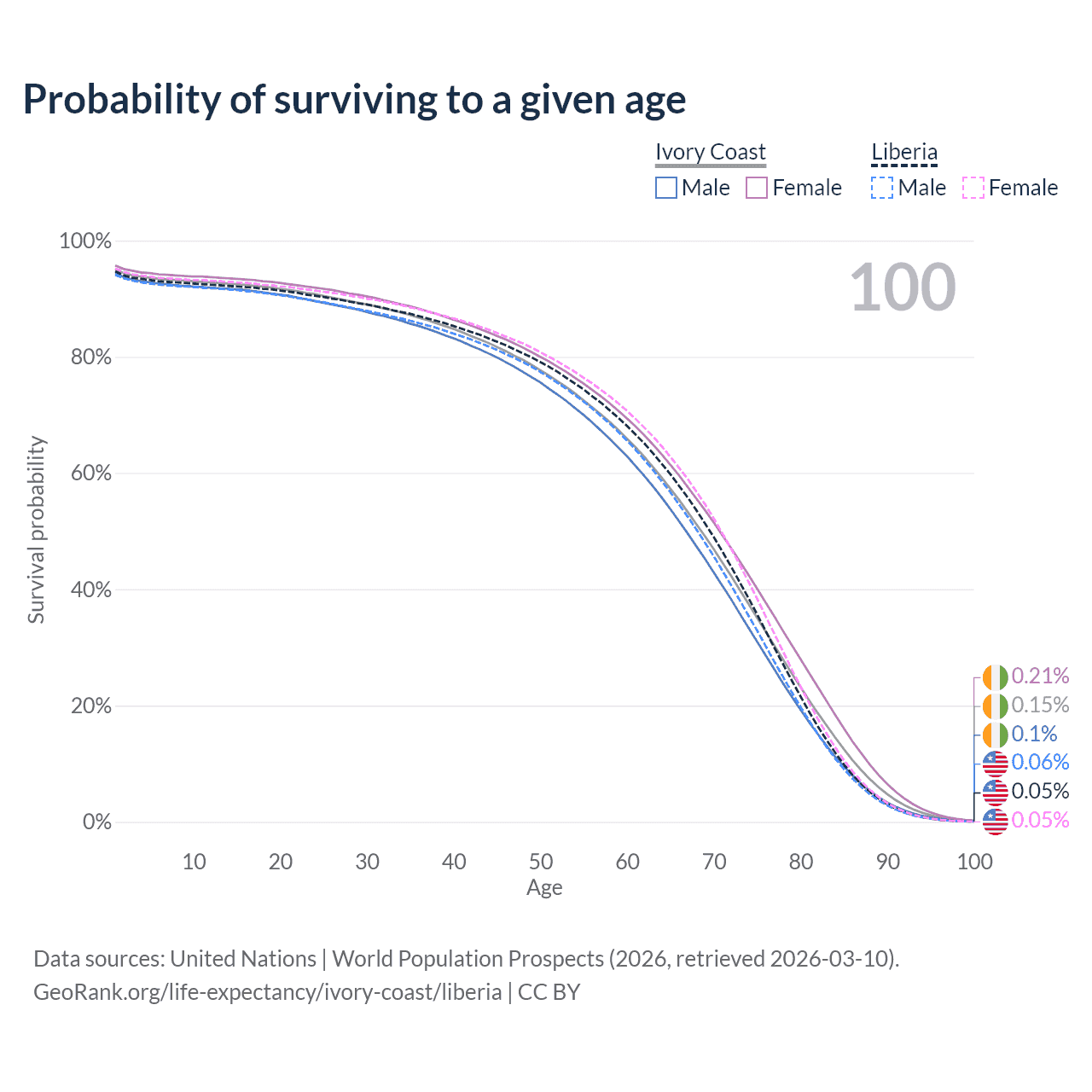 This life expectancy calculator shows the odds of living to 100, 95, 90, and below based on current age for both males and females in Ivory Coast and Liberia, along with mean and median age of death. The calculations are based on the 2026 life tables (actuarial tables) from the UN World Population Prospects.
