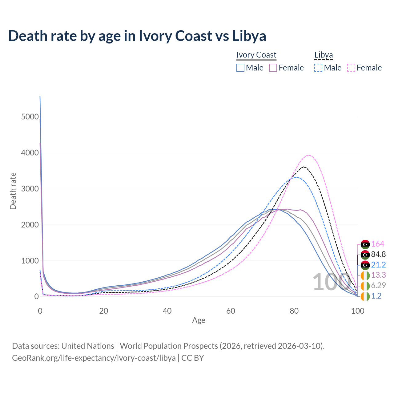 In Ivory Coast, the most common age of death is 0, compared to 83 in Libya. The median age of death is 68.6 in Ivory Coast and 78.8 in Libya, meaning only half of each cohort is expected to live past that age.