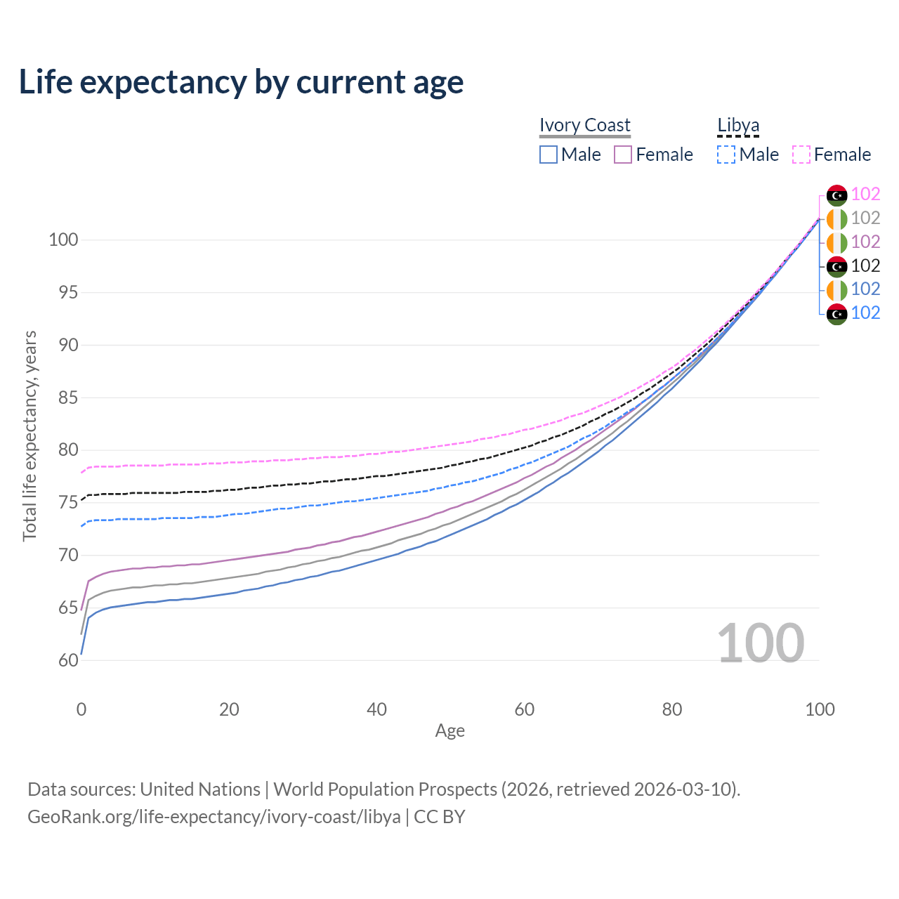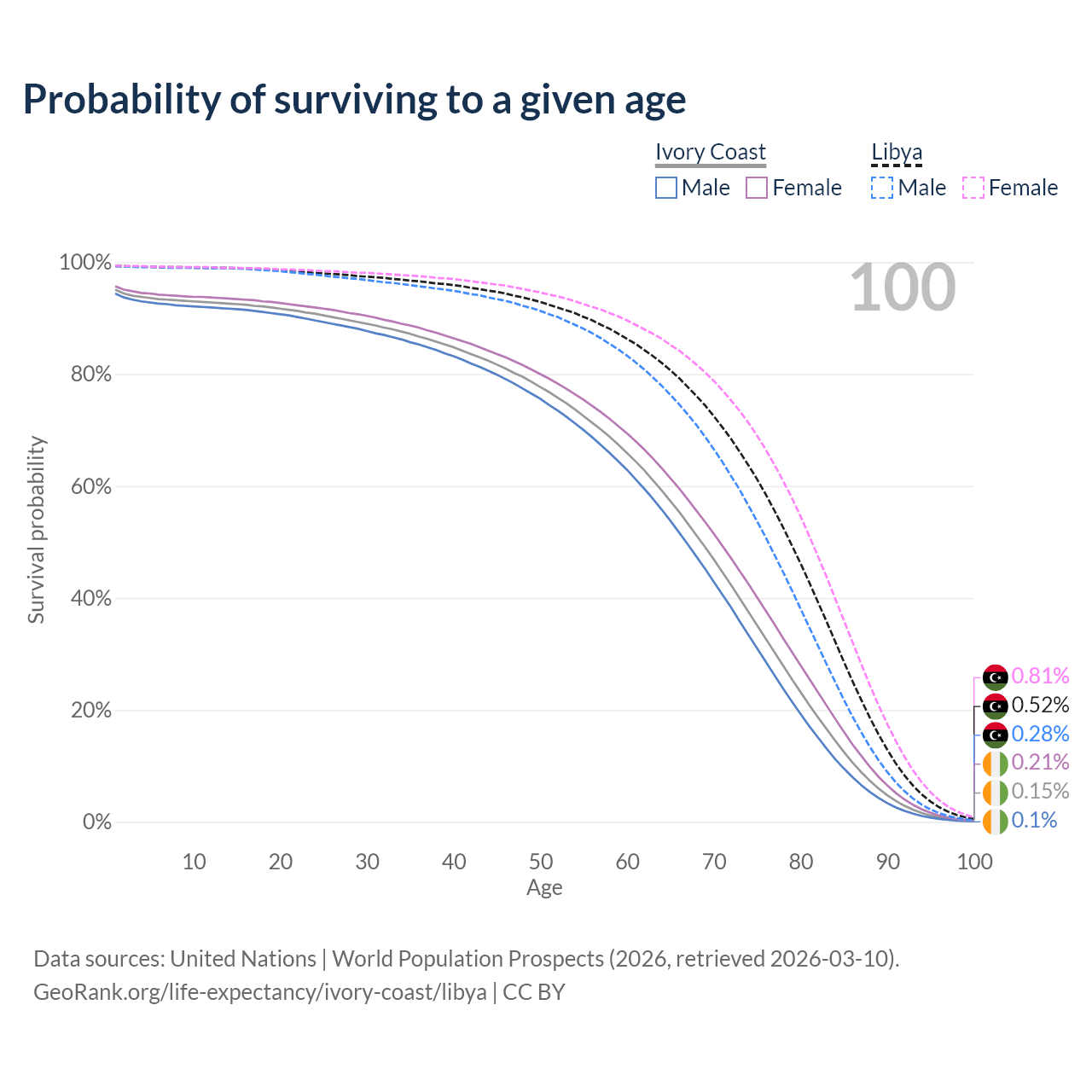 This life expectancy calculator shows the odds of living to 100, 95, 90, and below based on current age for both males and females in Ivory Coast and Libya, along with mean and median age of death. The calculations are based on the 2026 life tables (actuarial tables) from the UN World Population Prospects.