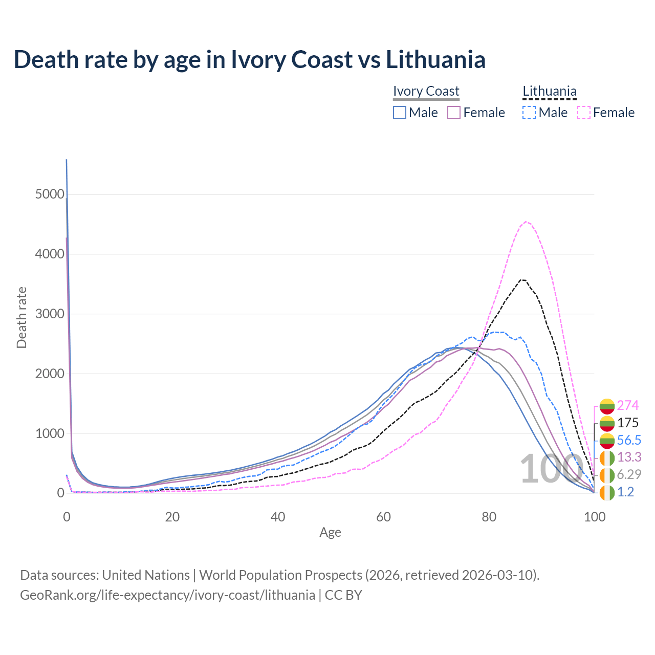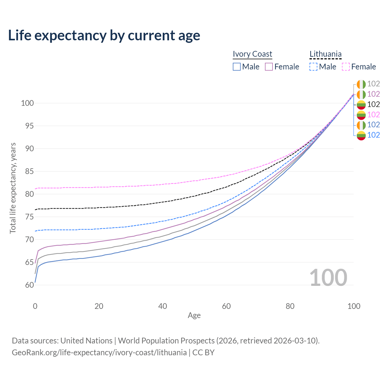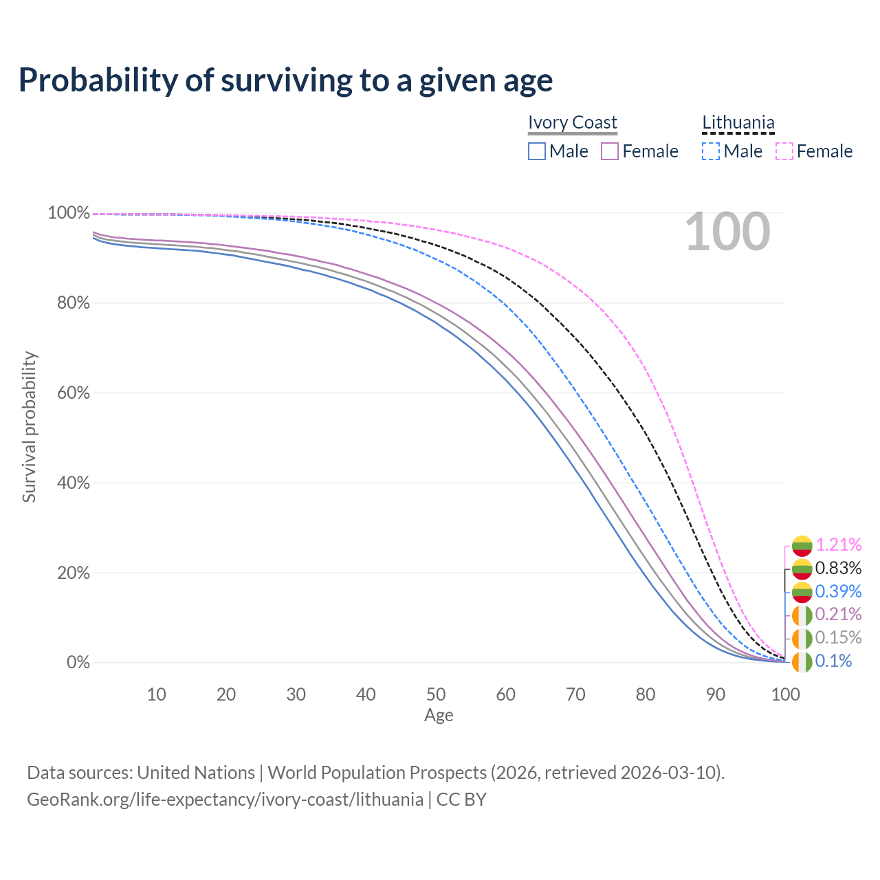 This life expectancy calculator shows the odds of living to 100, 95, 90, and below based on current age for both males and females in Ivory Coast and Lithuania, along with mean and median age of death. The calculations are based on the 2026 life tables (actuarial tables) from the UN World Population Prospects.