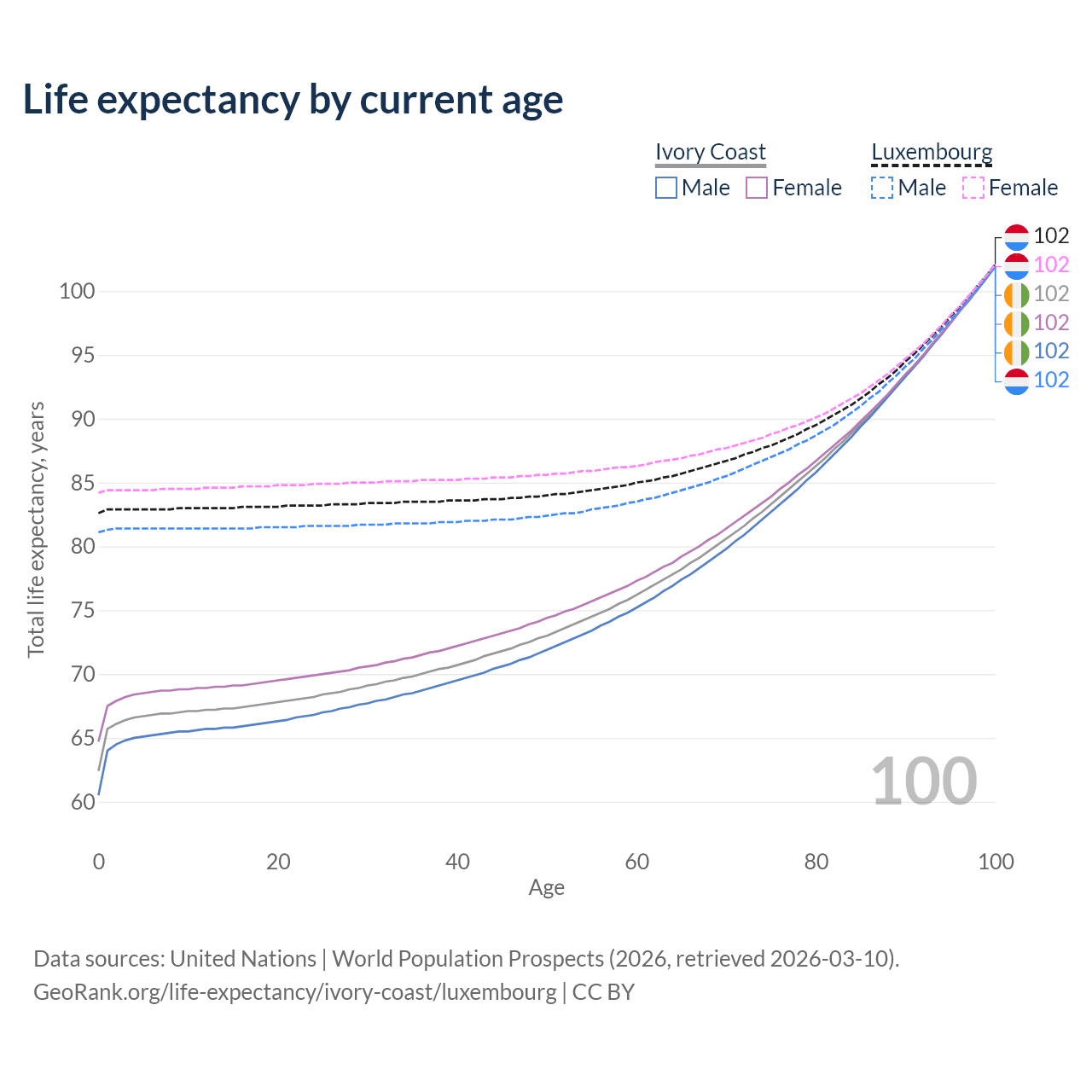This life expectancy calculator shows the odds of living to 100, 95, 90, and below based on current age for both males and females in Ivory Coast and Luxembourg, along with mean and median age of death. The calculations are based on the 2026 life tables (actuarial tables) from the UN World Population Prospects.