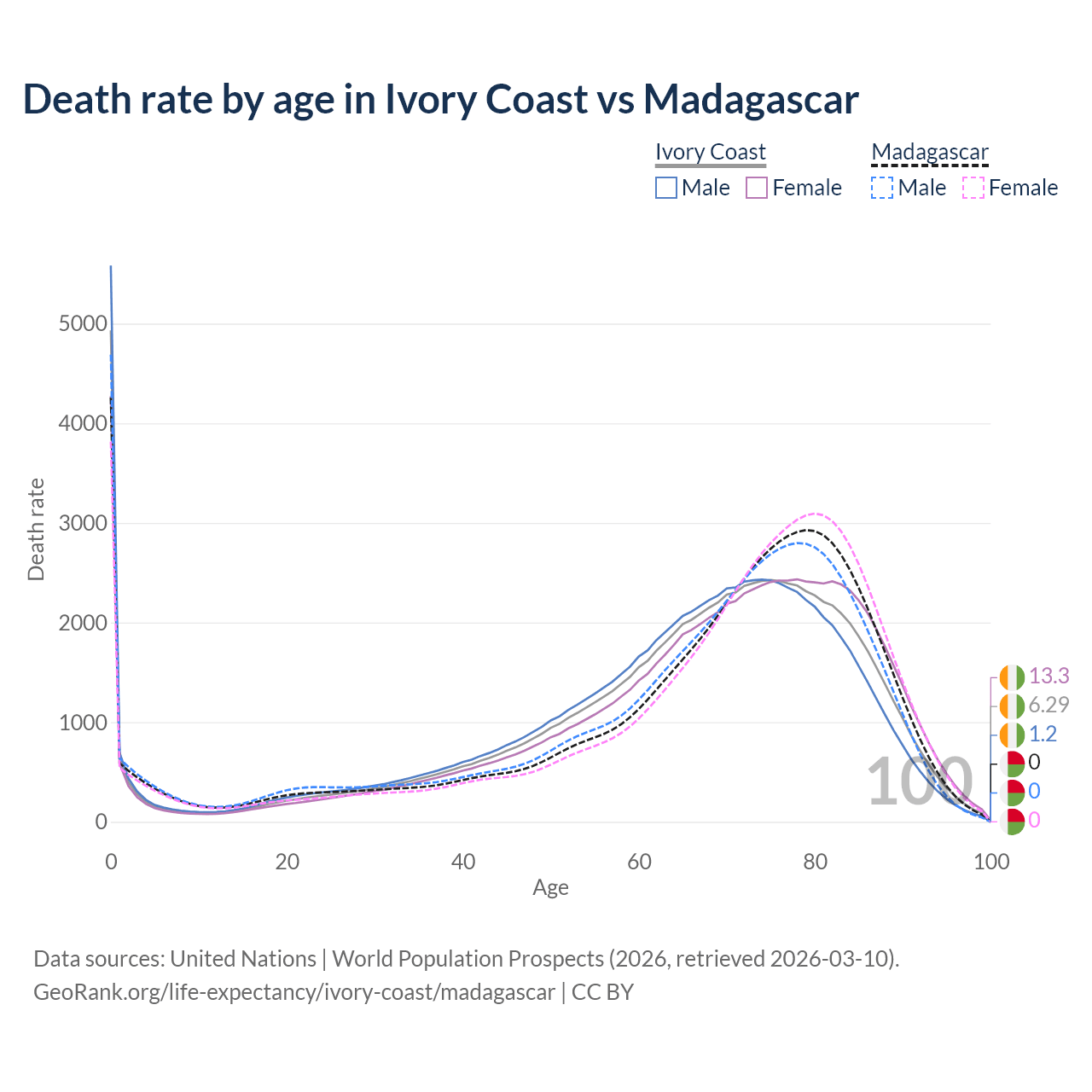 In Ivory Coast, the most common age of death is 0, compared to 0 in Madagascar. The median age of death is 68.6 in Ivory Coast and 72.2 in Madagascar, meaning only half of each cohort is expected to live past that age.