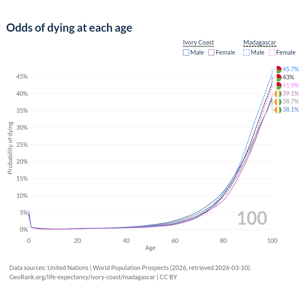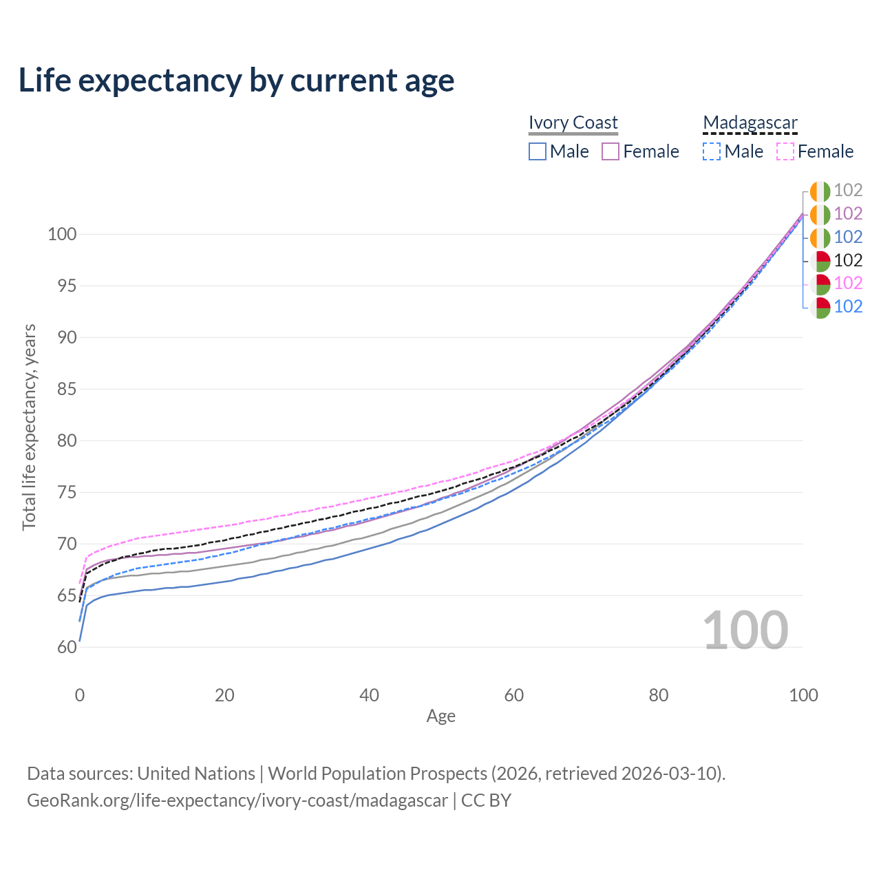 This life expectancy calculator shows the odds of living to 100, 95, 90, and below based on current age for both males and females in Ivory Coast and Madagascar, along with mean and median age of death. The calculations are based on the 2026 life tables (actuarial tables) from the UN World Population Prospects.