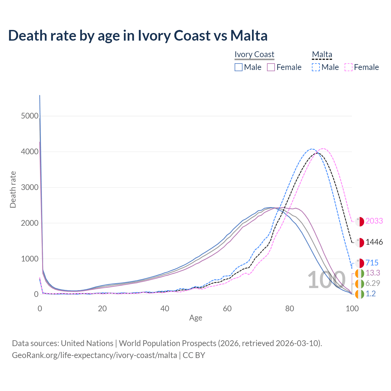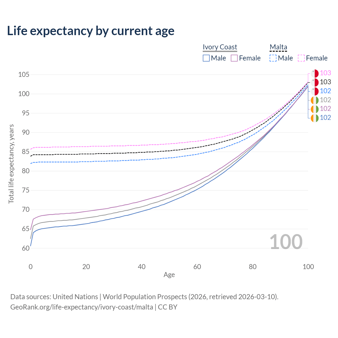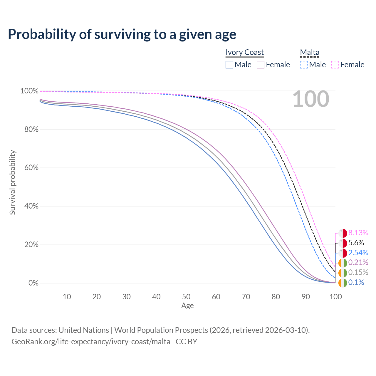 This life expectancy calculator shows the odds of living to 100, 95, 90, and below based on current age for both males and females in Ivory Coast and Malta, along with mean and median age of death. The calculations are based on the 2026 life tables (actuarial tables) from the UN World Population Prospects.