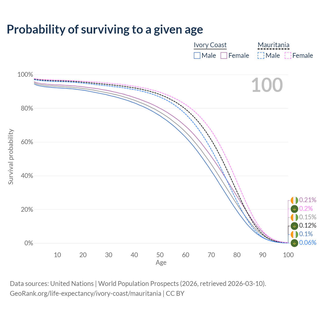This life expectancy calculator shows the odds of living to 100, 95, 90, and below based on current age for both males and females in Ivory Coast and Mauritania, along with mean and median age of death. The calculations are based on the 2026 life tables (actuarial tables) from the UN World Population Prospects.