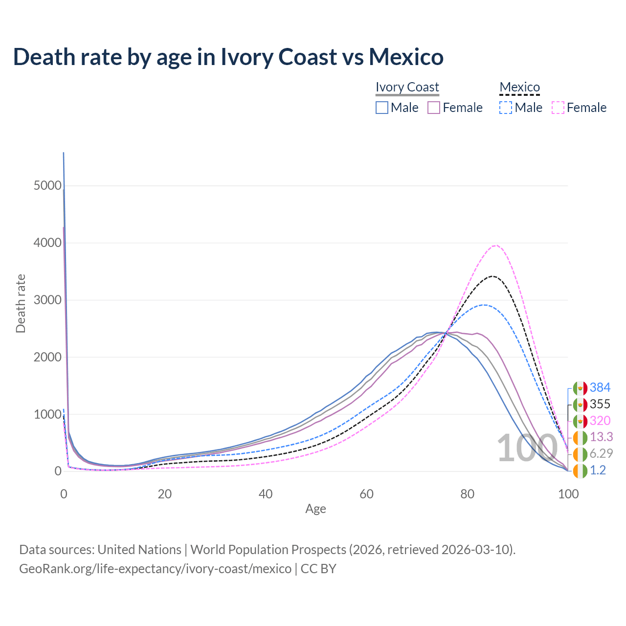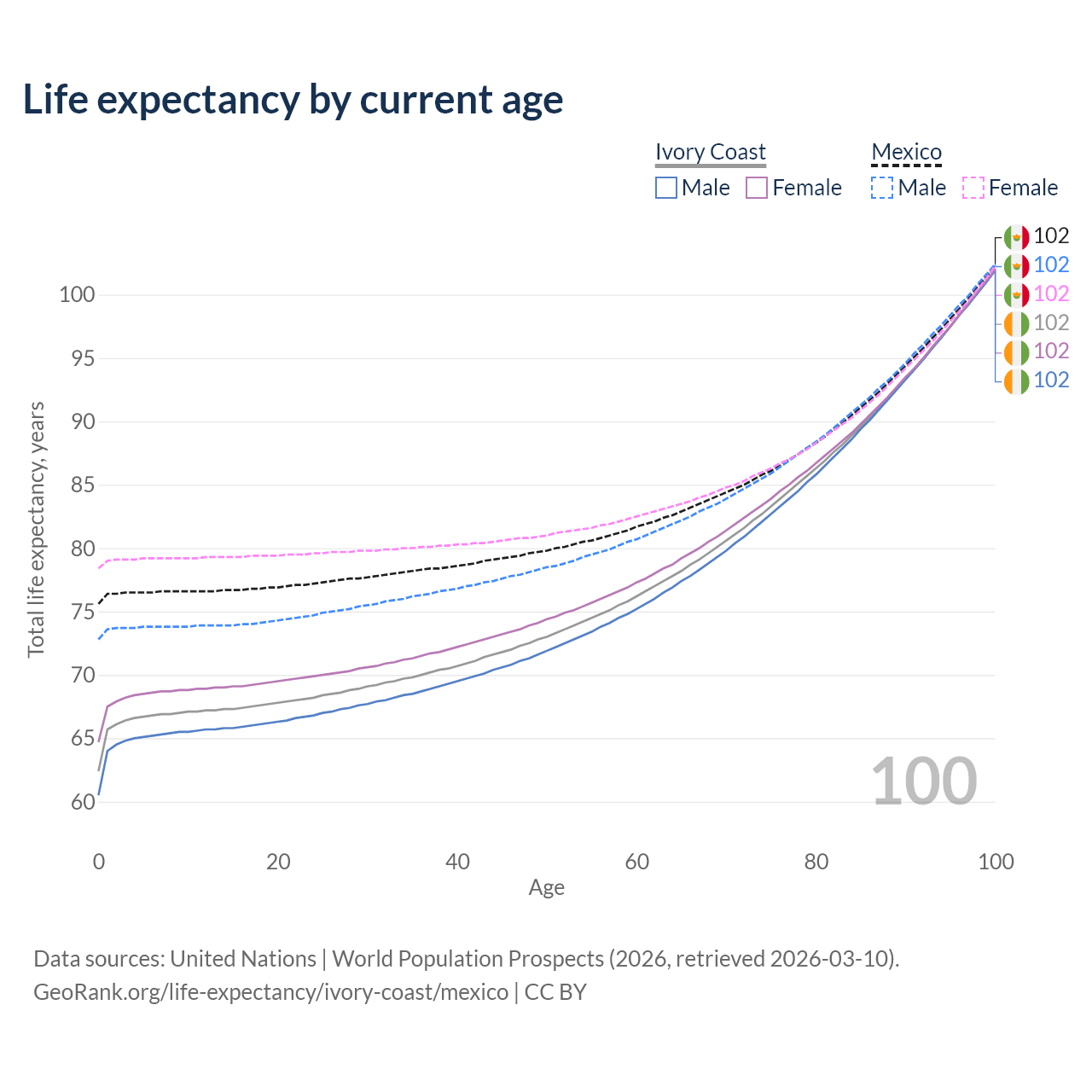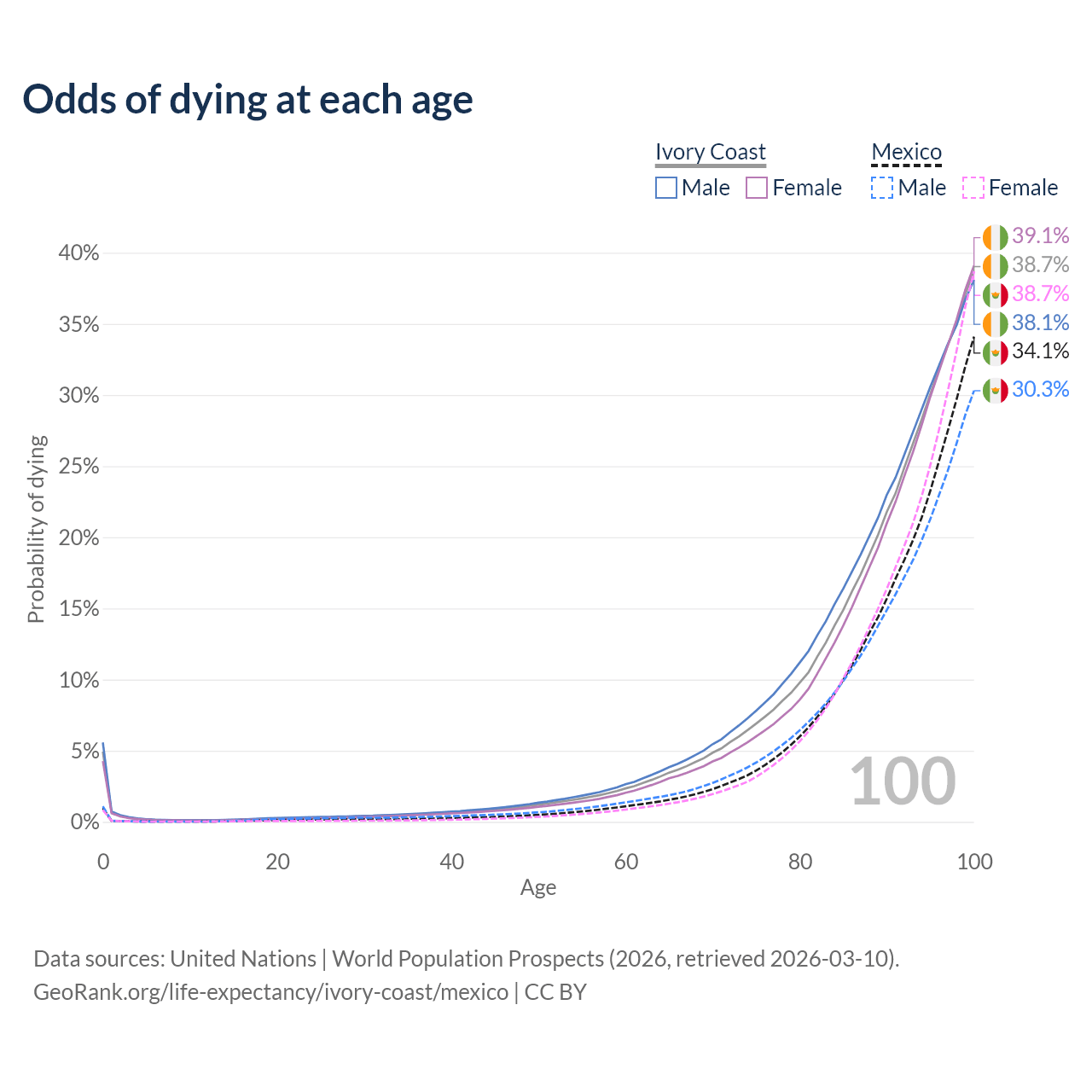 This life expectancy calculator shows the odds of living to 100, 95, 90, and below based on current age for both males and females in Ivory Coast and Mexico, along with mean and median age of death. The calculations are based on the 2026 life tables (actuarial tables) from the UN World Population Prospects.