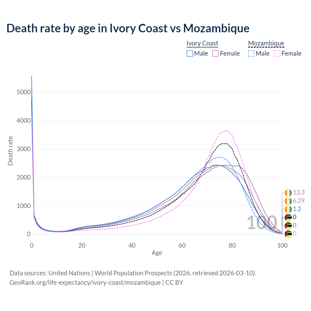 In Ivory Coast, the most common age of death is 0, compared to 0 in Mozambique. The median age of death is 68.6 in Ivory Coast and 71.2 in Mozambique, meaning only half of each cohort is expected to live past that age.