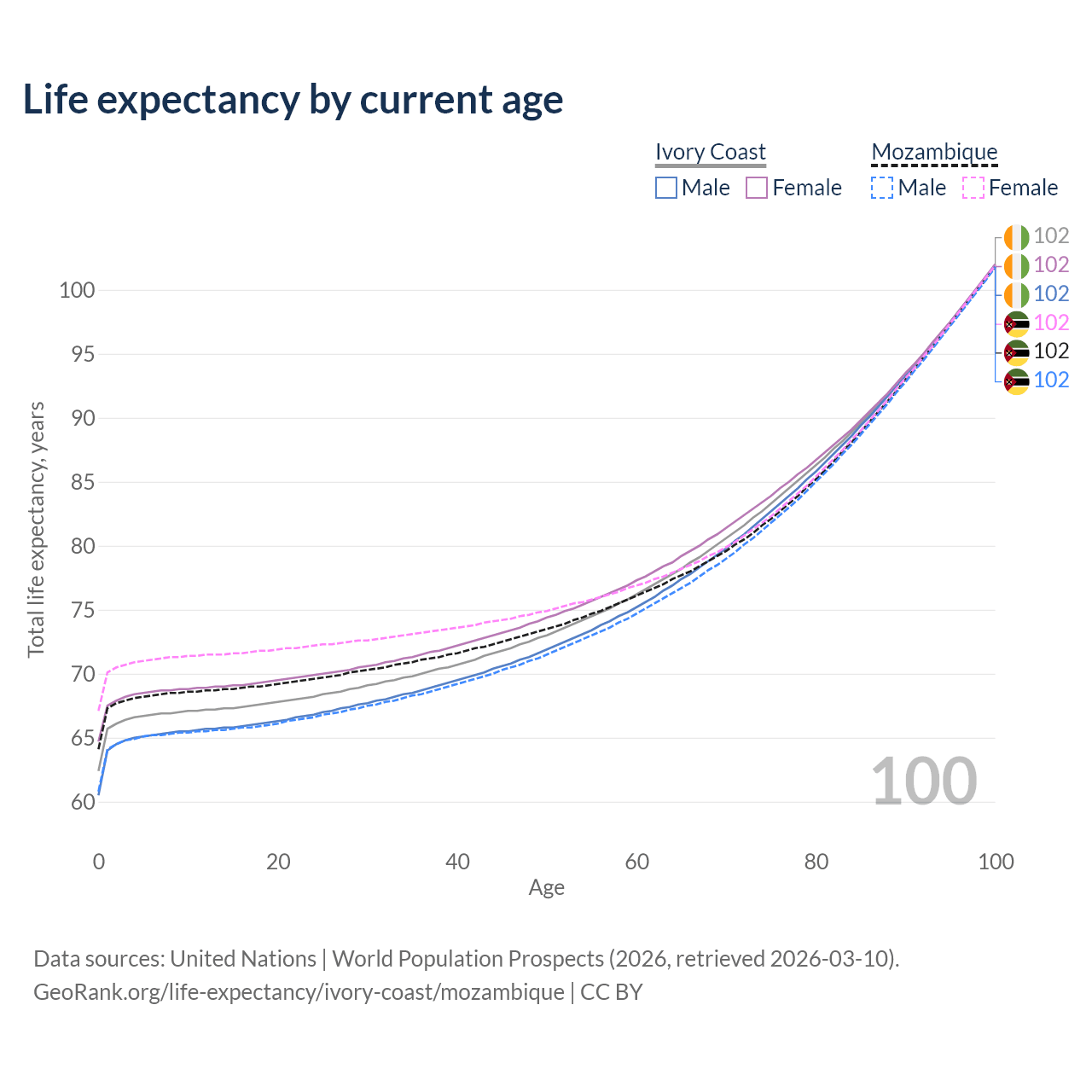 This life expectancy calculator shows the odds of living to 100, 95, 90, and below based on current age for both males and females in Ivory Coast and Mozambique, along with mean and median age of death. The calculations are based on the 2026 life tables (actuarial tables) from the UN World Population Prospects.